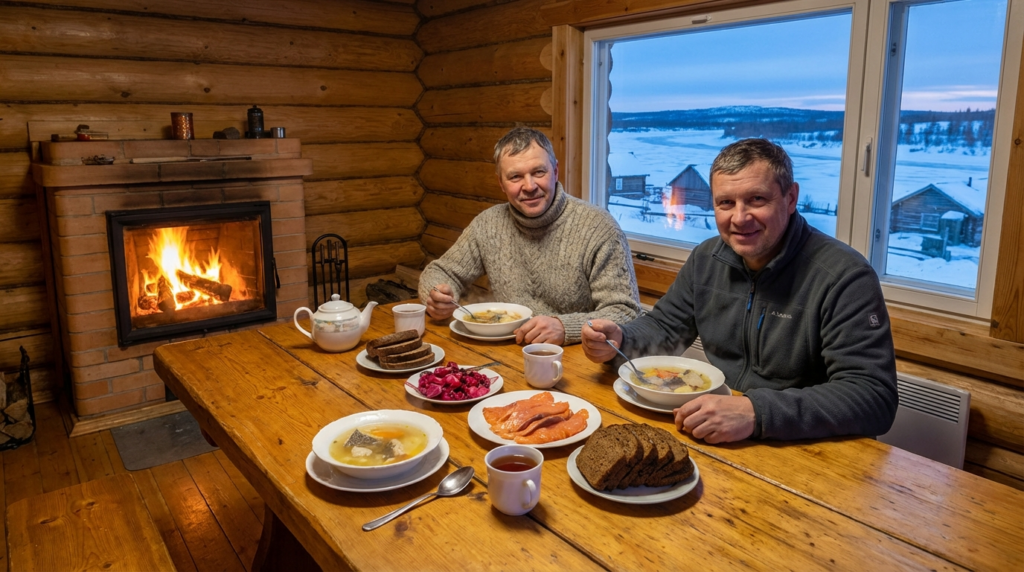 Снаружи — нетронутая тайга Мезенского района, где на 200 километров вокруг нет ни одной живой души. Внутри — уютный глемпинг, где шеф-повар подает «помакуху». Это легендарное блюдо: треска или сёмга, томленая в молоке с луком и сливочным маслом. Поморы первыми в России начали пить кофе из самоваров, закупая зерна у норвежцев в обмен на рыбу. И сегодня на наших базах утро начинается не с растворимого порошка, а с авторского кофе с щепоткой северной соли, который подает гид перед выходом на реку. Это и есть та самая «суверенная кухня», о которой говорят на фестивале «Еда поморская» в Архангельске, но которую по-настоящему можно прочувствовать только здесь, на краю земли.