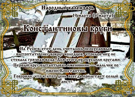 ✔️На Руси в этот день считалось необходимым вытоптать снег вокруг колодцев, чтобы в них не стекала грязная вода. Для этого их обходили кругами. Первый круг доверяли вытоптать мальчику по имени Константин.