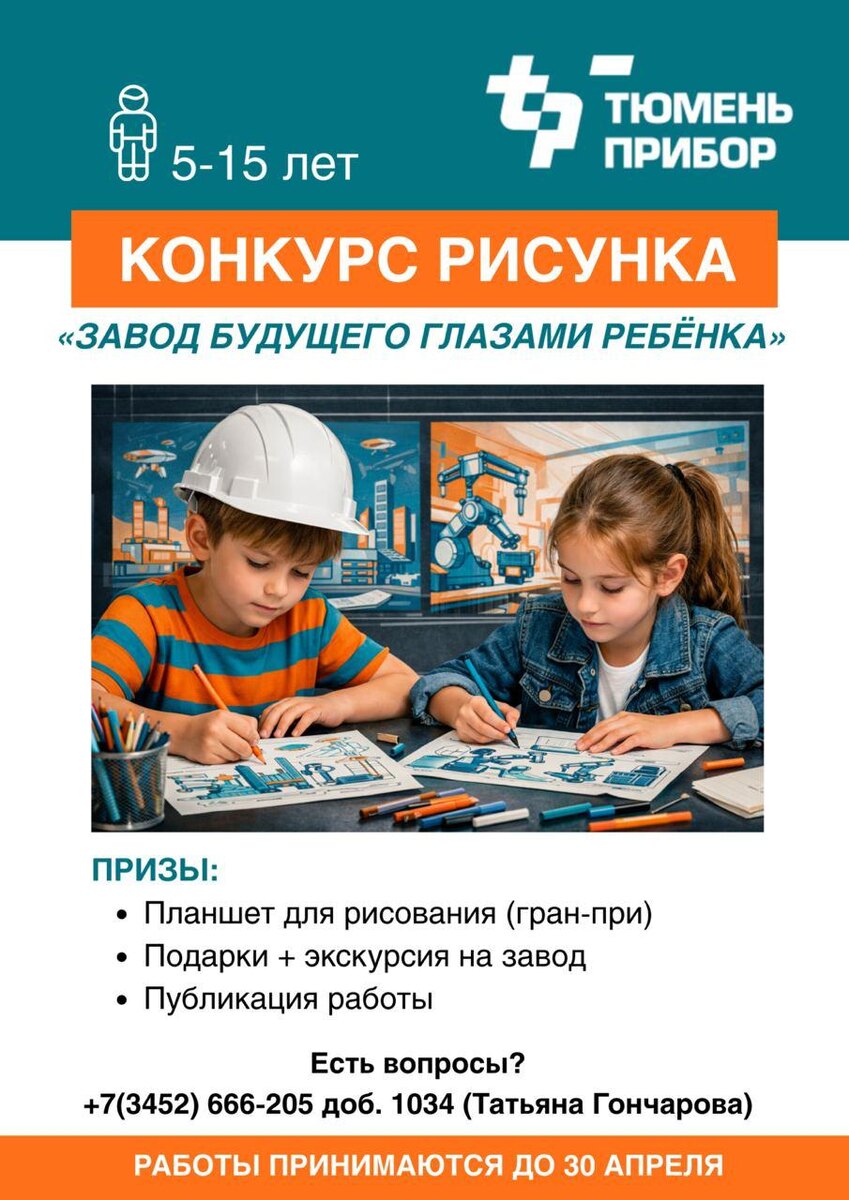 «Завод будущего глазами ребёнка» Мы создаём современные технологические решения и хотим увидеть, каким будущее видят дети💡 🎨 ЧТО НУЖНО СДЕЛАТЬ? Нарисовать, как ребёнок представляет: ▫️ завод будущего ▫️ роботов и современные технологии ▫️ умные приборы, которые помогают людям ▫️ мир технологий глазами ребёнка 🖍 КАК ПОДГОТОВИТЬ РИСУНОК? ✔️ Формат — А3 (бумага 200 гр и выше) ✔️ Материалы — любые (краски, карандаши, фломастеры) ✔️ Работа выполняется ребёнком самостоятельно 🎁 Главный приз — планшет для рисования 🎁 Подарки + экскурсия на завод 🎁 Публикация работы 🎁 Дипломы и памятные призы 🗓 Приём работ — до 30 апреля 🗓 Итоги — 15 мая 📍 КУДА ПРИНЕСТИ РИСУНОК? 📌 Завод «Тюмень Прибор» рп. Боровский, п/р Южный, стр. 5 📌 Центр «ASTRA» г. Тюмень, ул. 50 лет Октября, 29/4 📌 Центр «ASTRA» г. Тюмень, ул. Мельникайте, 32 📞 ЕСТЬ ВОПРОСЫ? Координатор конкурса: +7 (3452) 666-205 доб. 1034 Татьяна Гончарова