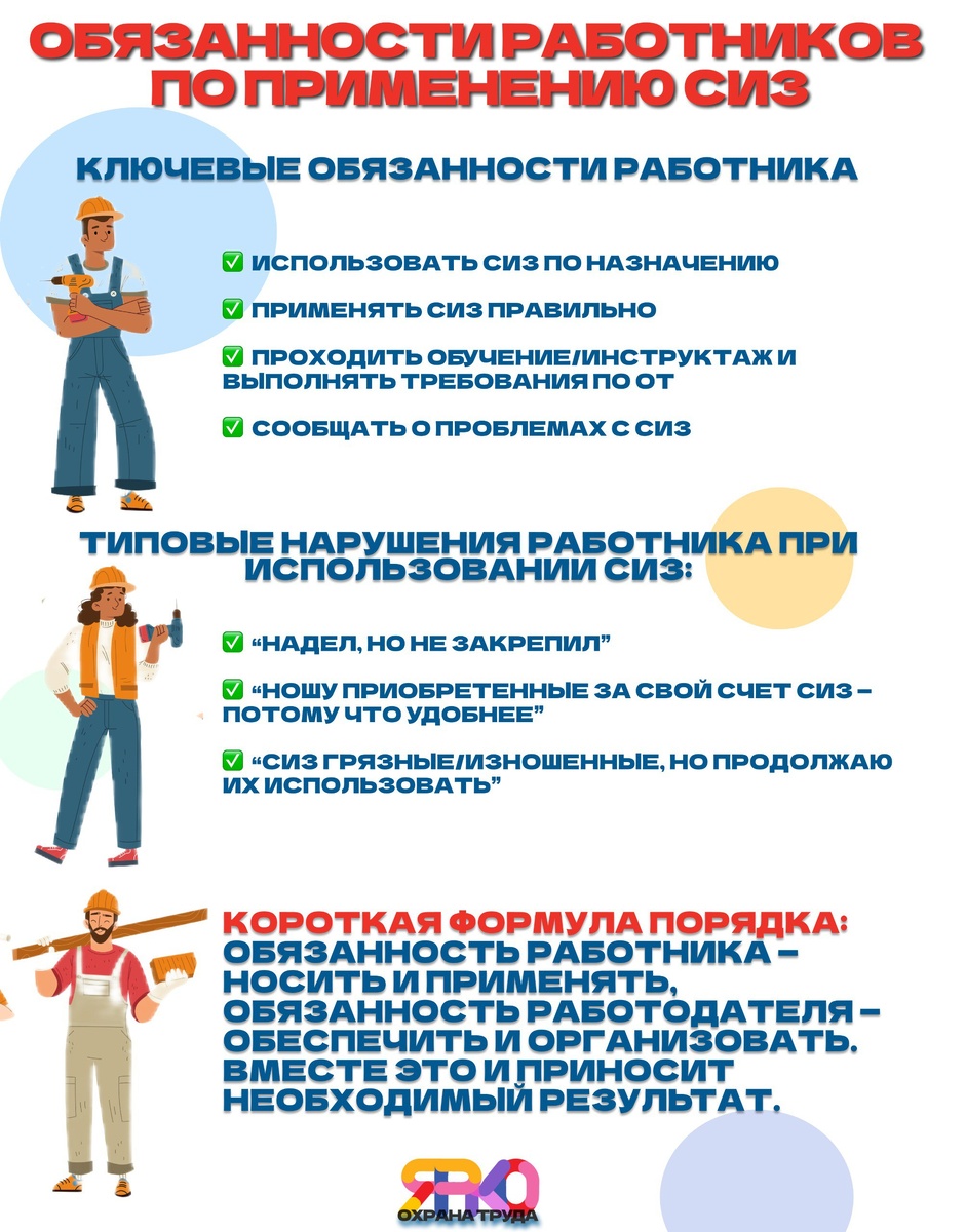 СИЗ начинают “работать” только в двух случаях: когда они правильно подобраны и когда работник правильно их применяет. Нормативные требования: ➡️ТК РФ, ст. 215: работник обязан использовать и правильно применять СИЗ и проходить обучение по охране труда, включая обучение по применению СИЗ. ➡️Приказ Минтруда № 766н: отдельный раздел «Обязанности работников по применению СИЗ». Ключевые обязанности работника (что реально проверяют и что влияет на безопасность) 1️⃣Использовать СИЗ по назначению Применение во вредных или опасных условиях выполнения конкретной работы и наличия определенного риска. 2️⃣Применять СИЗ правильно Например: респиратор — с корректной посадкой и необходимой герметичностью, каска — с застегнутым ремешком, очки — при наличии опасности для органов зрения ситуации риска. Общий принцип “правильно применять” прямо указан в ТК РФ. 3️⃣Проходить обучение/инструктаж и выполнять требования по ОТ Если необходимость в обучении по применению СИЗ предусмотрено их сложной конструкци
