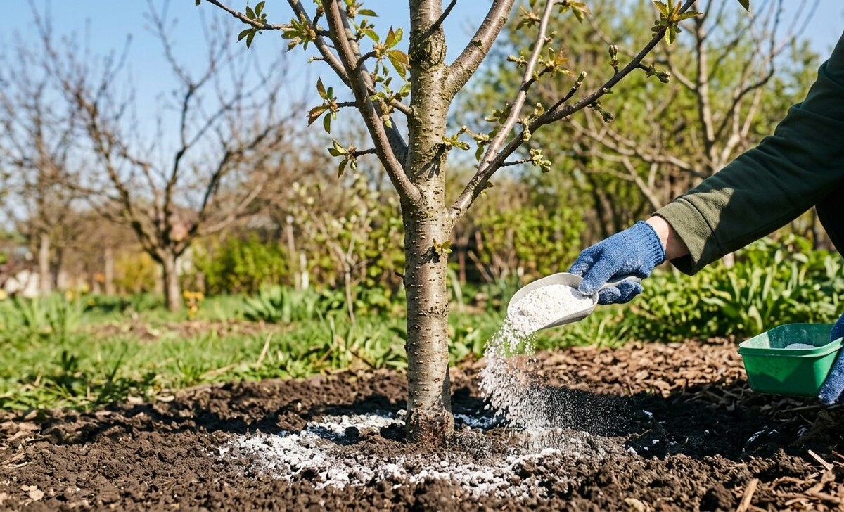 Как только сойдет снег и земля чуть оттает, я беру доломитовую муку. Это не удобрение в чистом виде, это скорей «раскислитель». Вишня со сливой, они же косточковые, терпеть не могут кислую почву, сразу чахнут. Я сыплю ее щедро, примерно по стакану под деревце, прямо по влажной земле. И слегка граблями заделываю. Пусть земля подышит и приведет свою кислоту в порядок. После этого нужно дать деревцу недельку-другую на раскачку.