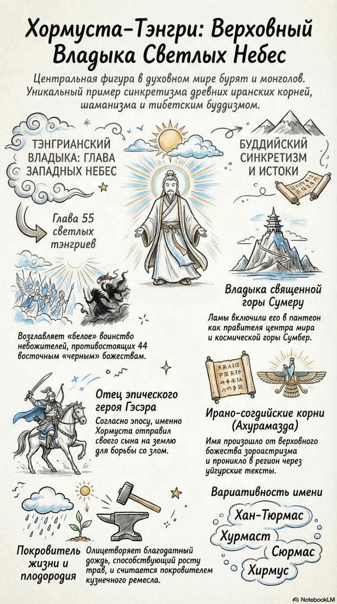 Хормуста-Тэнгри — центральная фигура в духовной культуре бурят и монголов, представляющая собой уникальный пример религиозного синкретизма. Имя божества восходит к древнеиранскому Ахура-Мазде и проникло в регион через согдийские и уйгурские тексты. Тэнгрианский и буддийский статус В шаманском пантеоне он возглавляет 55 западных «белых» тэнгриев, противостоящих 44 восточным «черным» божествам. В буддийской традиции Хормуста отождествляется с Индрой и почитается как правитель центра мира — священной горы Сумеру. Мифологическая роль и функции Согласно героическому эпосу, Хормуста является отцом Гэсэра, которого он отправил на землю для борьбы со злом. Божество выступает покровителем жизни, плодородия и кузнечного ремесла. Он олицетворяет благодатный дождь, способствующий росту трав и благополучию скота. Вариативность его имени (Хан-Тюрмас, Сюрмас, Хирмус) отражает масштаб распространения его культа в Центральной Азии. https://t.me/chimitdorzhi_studio