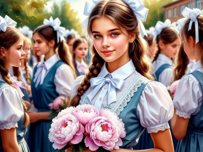 Нарядная, в белом фартуке, с гладиолусами в половину роста. Лёшка — подтянутый, счастливый. Рядом — бабушка, дед. Семья. Солнце. Музыка.