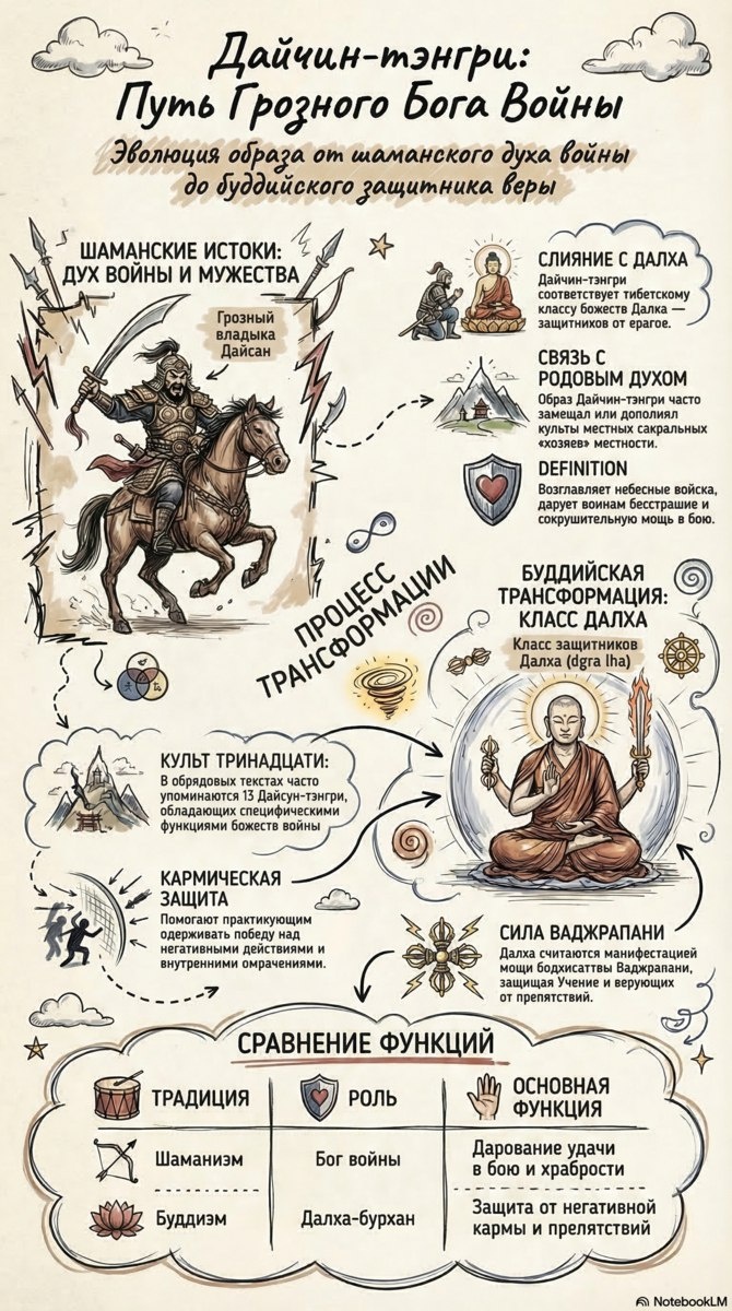 Дайчин-тэнгри (Дайсун) — божество войны и мужества в мифологии бурят и монголов. В шаманской традиции он почитается как владыка небесных войск, дарующий воинам бесстрашие и мощь в бою. Его культ тесно связан с родовыми духами и часто включает упоминание тринадцати Дайсун-тэнгри, наделенных специфическими защитными функциями. В буддизме образ трансформировался, войдя в класс божеств Далха. В этой ипостаси он считается проявлением мощи бодхисаттвы Ваджрапани, защищающим Учение и верующих. Если исходная функция божества заключалась в обеспечении победы в реальном сражении, то в буддийском контексте она расширилась до кармической защиты. Дайчин-тэнгри помогает преодолевать негативные действия и внутренние омрачения, устраняя препятствия на духовном пути и оберегая от внешних угроз. Канал нашей студии https://t.me/chimitdorzhi_studio