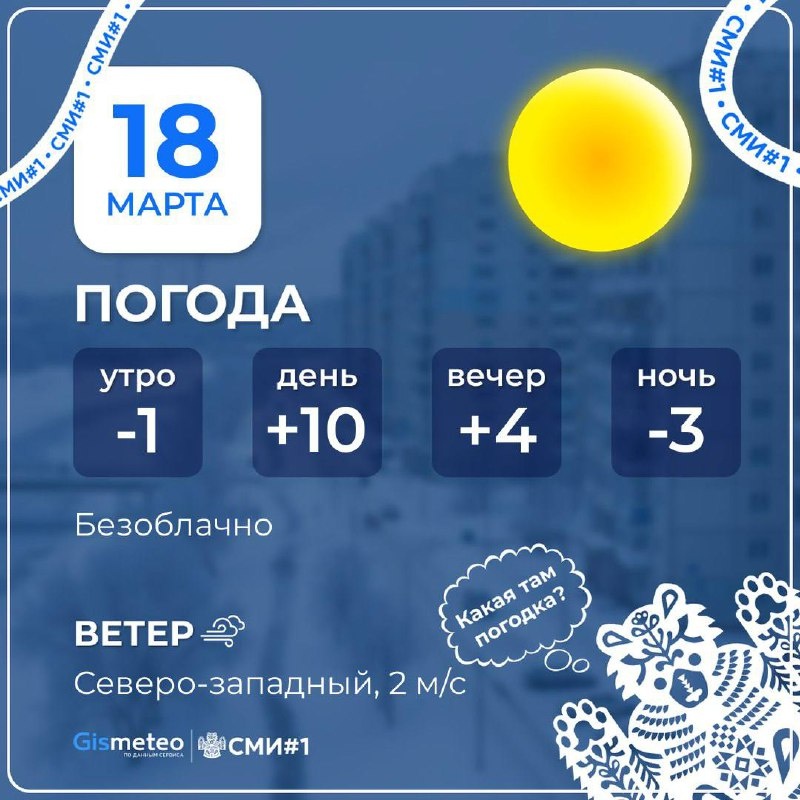 Синоптики прогнозируют теплую и солнечную погоду. Вечером похолодает до +4 градусов. Ветер слабый — 2 м/с.