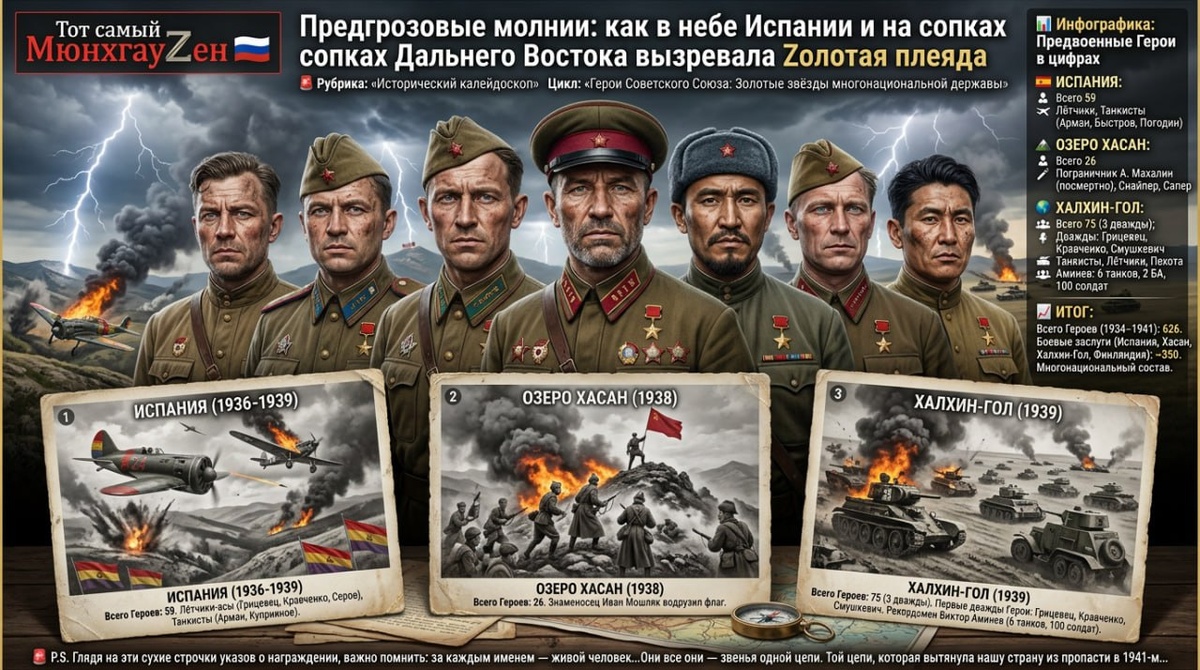 🚨 Рубрика: «Исторический калейдоскоп» Цикл: «Герои Советского Союза: Золотые звёзды многонациональной державы» 📅 Предгрозовые молнии: как в небе Испании и на сопках Дальнего Востока вызревала Zолотая плеяда 🔹 Факт: Между челюскинской эпопеей 1934 года и грозовым сорок первым пролегла полоса военных конфликтов, ставшая для Красной Армии суровой школой мужества. Испания, озеро Хасан, Халхин-Гол — эти названия звучат сегодня как главы одного большого романа о взрослении. Именно там, в пыльных долинах Кастилии и на дальневосточных сопках, вызревала та самая плеяда героев, которой суждено будет через несколько лет остановить бронированные армады вермахта. Звание Героя Советского Союза, до 1936 года присваивавшееся только за подвиги в мирное время, впервые пошло в бой. Всего за эти предвоенные кампании высшей награды удостоились 160 человек: 59 за Испанию , 26 за озеро Хасан и 75 за Халхин-Гол (включая первых дважды Героев). И каждый из них — русский, украинец, белорус, татарин, еврей