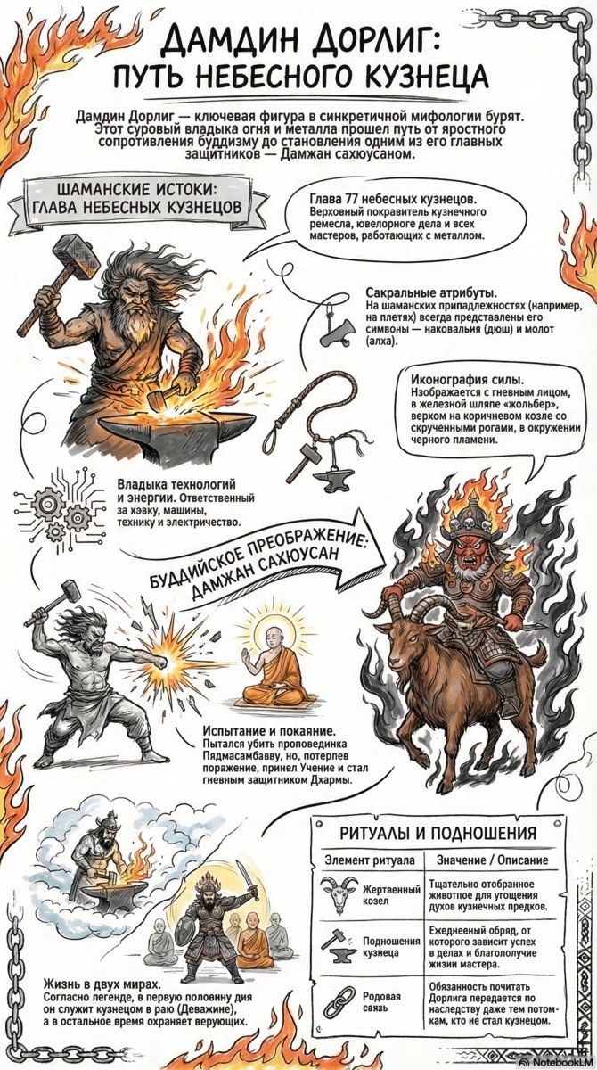 Дамдин Дорлиг — ключевая фигура в синкретичной мифологии бурят, прошедшая путь от шаманского божества до буддийского защитника Дамжан Сахюусана. В шаманской традиции он почитается как глава 77 небесных дарханов, покровитель кузнечного и ювелирного дела. Его атрибуты — наковальня и молот — изображаются на ритуальных принадлежностях. Буддийская трансформация божества связана с его усмирением Падмасамбхавой. После признания превосходства Учения он стал гневным защитником Дхармы. Иконография представляет его верхом на коричневом козле со скрученными рогами, в железной шляпе «жолбер», в окружении черного пламени. Сегодня он также воспринимается как покровитель технологий и электричества. Почитание божества носит родовой характер. Согласно легендам, часть дня он служит кузнецом в раю Диважин, а в остальное время охраняет верующих. Образ Дамдин Дорлига объединяет древнее ремесленное мастерство и современную технологическую энергию. https://dzen.ru/id/670c7fe545d6d72caa724e37