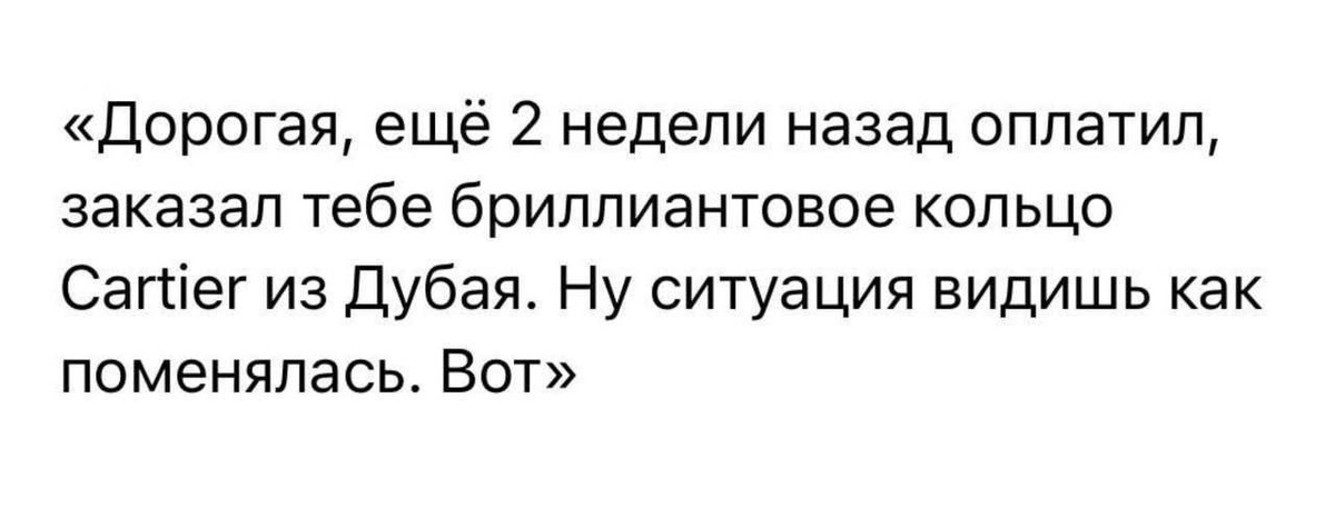 Они прожили вместе 15 лет. Она родила сына, но все никак не женились. Я, честно говоря, думала они просто идейные. Ну есть такие люди, которые принципиально живут и не расписываются. Там обычно целый манифест, обосновывающий такое решение. Я не вникала, считаю, что каждому свое. Вот и тут я думала аналогично. Жили они всегда небедно, регулярно летали за многа деняк в хорошие отели. И сейчас у них на лето был куплен тур по раннему бронированию, ещё в декабре купили. А тут она звонит в слезах и рассказывает, что он загулял, вот уже два месяца как, при этом он намерен жениться на той и теперь выгоняет сына и "жену". Тур аннулируется, трагедия, слезы и пр. Я в ах..шоке. Сочувствую, выслушиваю. А ей видимо поделиться хотелось. Ну и рассказала, что он все эти годы ей лил в уши, что хочет сделать красиво дорого и солидно. Колечко чтобы обязательно Тиффани и чтобы куплено в Нью-Йорке на пятой авеню. Свадебное на Сейшелы, а лучше на Бора-Бора. Вот она верила и ждала... Дождалась, блин 💀