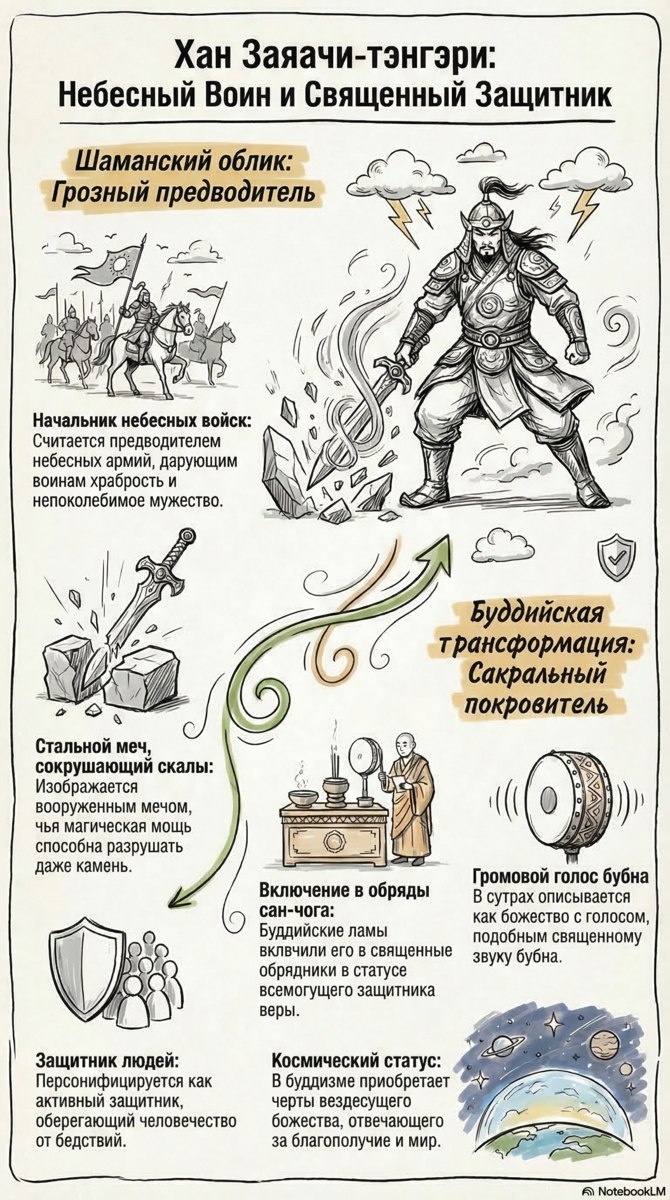 Хан Заяачи-тэнгэри — значимая фигура в шаманской и буддийской традициях Бурятии. В шаманизме он почитается как грозный предводитель небесных армий, дарующий воинам храбрость и мужество. Его атрибут — магический стальной меч, способный сокрушать камень. В рамках буддийской трансформации божество было включено в обрядники «сан-чога» (ритуалы очищения и подношения благовоний) как защитник веры. В сутрах его голос сравнивается со священным звуком бубна, что подчеркивает его громовую природу. Буддийская традиция наделяет его статусом вездесущего покровителя, ответственного за благополучие и мир. Персонифицируясь как активный защитник, он оберегает человечество от бедствий и внешних угроз. Его образ фиксирует неразрывную связь между земным и космическим порядком, обеспечивая духовную защиту верующих. Канал нашей студии https://t.me/chimitdorzhi_studio