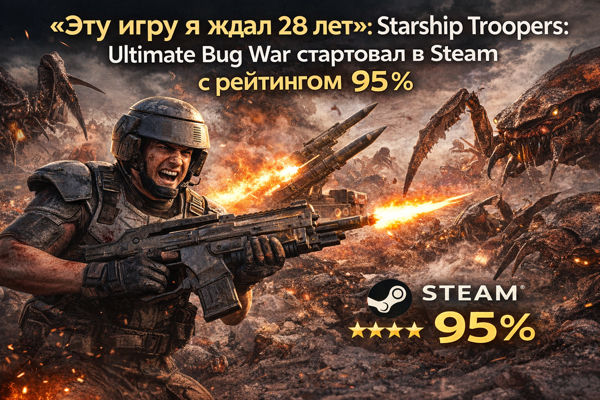Фраза «Эту игру я ждал 28 лет» стала одной из самых заметных реакций на запуск Starship Troopers: Ultimate Bug War. На старте в Steam игра действительно собрала около 300 отзывов с оценкой «очень положительные», а общий рейтинг достиг 95 %. Для новости это главное: релиз уже состоялся, и первые игроки встретили шутер заметно теплее, чем это часто бывает у новых запусков. Starship Troopers: Ultimate Bug War — это олдскульный шутер от издателя Dotemu и британской студии Auroch Digital, известной по Warhammer 40,000: Boltgun. По данным 3DNews, игра вышла 16 марта на PC, PS5, Xbox Series X и S, а также Nintendo Switch 2. В Steam она продаётся со скидкой до 23 марта, а для тех, кто не готов покупать сразу, доступна бесплатная демоверсия. Судя по первым отзывам, игроки особенно выделяют дух фильма «Звёздный десант» образца 1997 года, юмор, стрельбу, оптимизацию и наличие русского языка. Именно это и стало главным драйвером стартового интереса: для части аудитории речь идёт не просто о ново