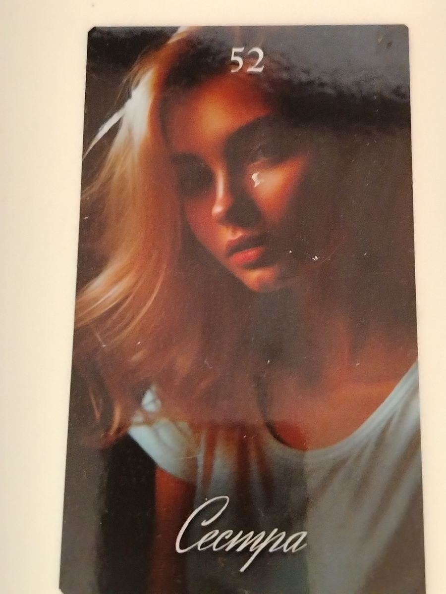 СЕСТРА. Значение этой карты- Поддержка во всем на весь день. Женская энергия, доверие, родственные узы. Близкий человек, женщина, ваш союзник. Возможен приезд сестры которую не видели очень долго. Исцеление эмоциональных ран. В работе помощь коллег, собеседование, принятие на работу, новая, должность. Перестаньте сравнивать себя с другими, Вы личность. Откройся поддержке, не бойся показаться слабой. Женская энергия лечит, когда идет от сердца. ВСЕМ ДОБРА!!!!!