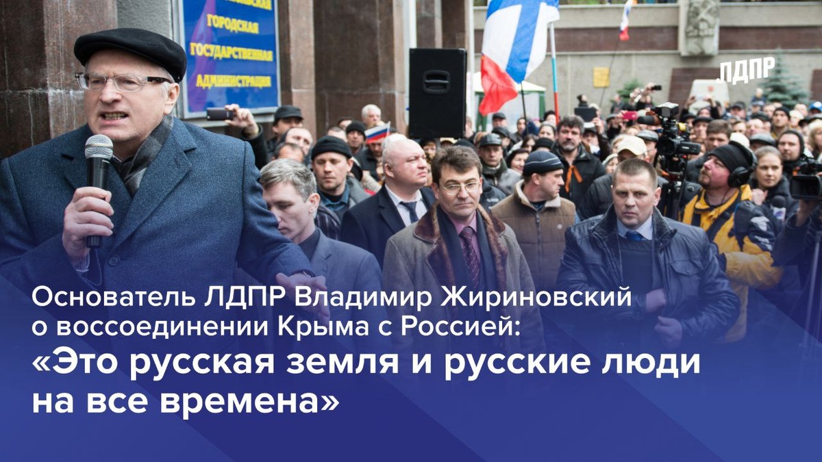 ЛДПР была единственной из парламентских партий, которая сделала воссоединение Крыма с Россией частью своей внешнеполитической программы, а Основатель ЛДПР Владимир Жириновский всегда боролся за то, чтобы нашу позицию услышали. ЛДПР с самого начала своей политической деятельности говорила, что Крым и Севастополь – неотъемлемая часть России. Мы смогли преодолеть все препятствия и снова объединиться. Это одно из самых значимых событий в истории нашей страны. «Это русская земля и русские люди на все времена», - говорил Владимир Жириновский о воссоединении Крыма с Россией. 🇷🇺Лидер ЛДПР Леонид Слуцкий был одним из первых политиков, которые поддержали воссоединение Крыма с Россией. Кроме того, он принимал участие в подготовке и проведении референдума. «Это событие войдёт в учебники. Об этом будут писать и через сто лет - как о восстановлении исторической справедливости», - говорил Леонид Эдуардович.