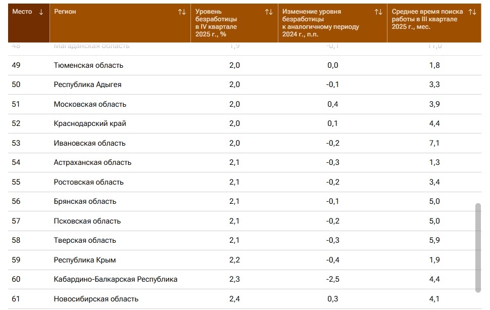 Астраханская область снова оказалась в середине рейтинга безработицы, но неожиданно вошла в число регионов с самым быстрым трудоустройством. В России подвели итоги по уровню безработицы в регионах за четвертый квартал 2025 года. Лидерами рейтинга стали Москва, Новгородская и Калужская области – здесь доля безработных не превысила одного процента. Низкие показатели также зафиксированы в Ямало-Ненецком и Ханты-Мансийском автономных округах, а также в Нижегородской области – около одного процента. Всего в 17 регионах страны уровень безработицы оказался ниже отметки в 1,5%. Рейтинг подготовили специалисты РИА Новости, которые проанализировали ситуацию на региональных рынках труда по итогам последнего квартала прошлого года. Исходя из составленного рейтинга Астраханская область по сравнению с прошлым годом потеряла две позиции и заняла 54‑е место в общероссийском списке. Однако, чтобы найти работу в нашем регионе и трудоустроиться, потребуется всего чуть больше месяца. Аналогичная ситуация