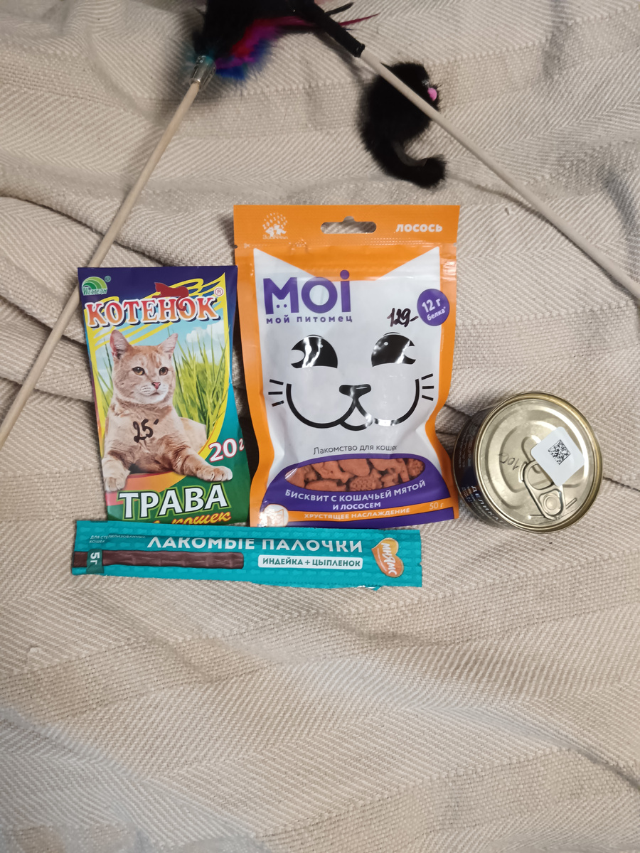 Каждому — по игрушке: мышка с колокольчиком и разноцветные пёрышки на палочке. Вкусняшки и деликатесы 😋