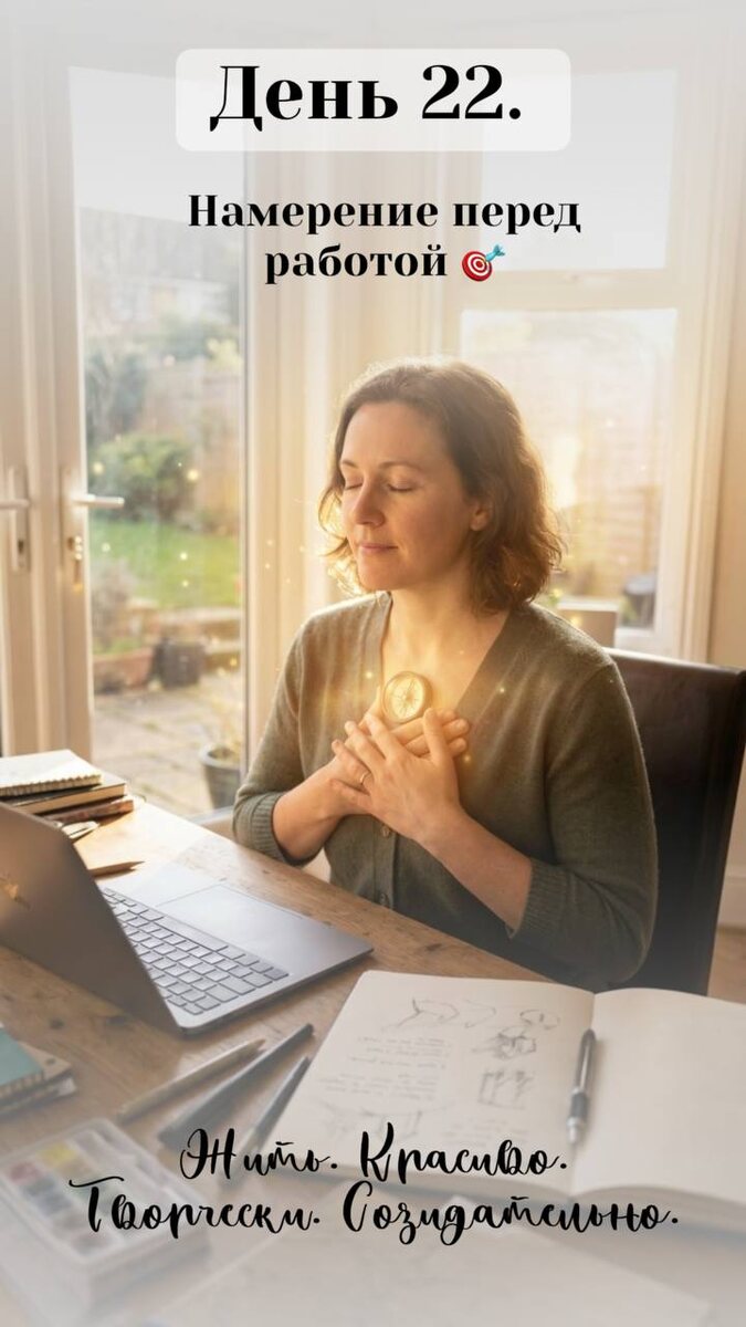 Красиво. Творчески. Созидательно.» ✨ 💼 Неделя 4: Дело жизни и служение (Работа, клиенты, финансы, мир) День 2️⃣2️⃣. Намерение перед работой 🎯 Мы входим в четвёртую неделю. И она будет о том, чему мы отдаём бо́льшую часть жизни, — о деле. О работе не как о способе заработать, а как о пространстве реализации, служения, творчества. Сегодняшнее задание простое и глубокое одновременно. Перед началом рабочего дня сформулируй одно намерение. Не список задач. Не план продаж. Не «сделать двадцать звонков». А именно намерение — качество, которое ты хочешь привнести в этот день. Спроси себя: «Сегодня я приношу в свою работу... что?» ✨ Лёгкость? ✨ Пользу для людей? ✨ Радость и удовольствие от процесса? ✨ Порядок и ясность? ✨ Вдохновение? ✨ Заботу о клиентах? ✨ Творческий поток? ✨ Спокойствие и уверенность? Выбери одно слово. Одно качество. И удерживай его в фокусе в течение дня. 🌟 Почему это меняет всё? Обычно мы начинаем работу с головы: «надо сделать, успеть, закрыть задачи». Это п