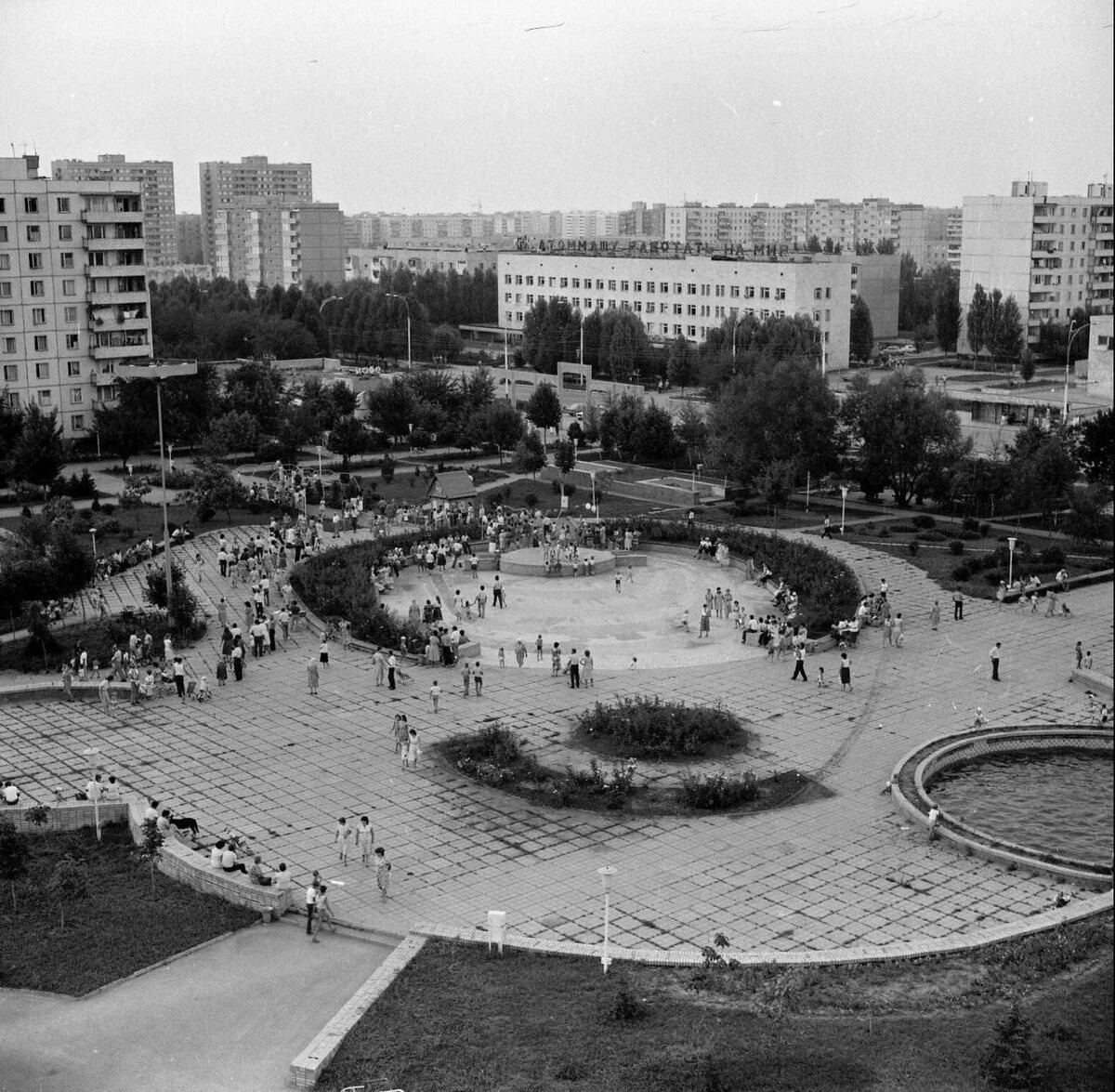 Архивное фото дня. конец 80-х годов. Вид на сквер «Дружба», который также выходит на поликлинику №3, расположенную на улице Энтузиастов.
