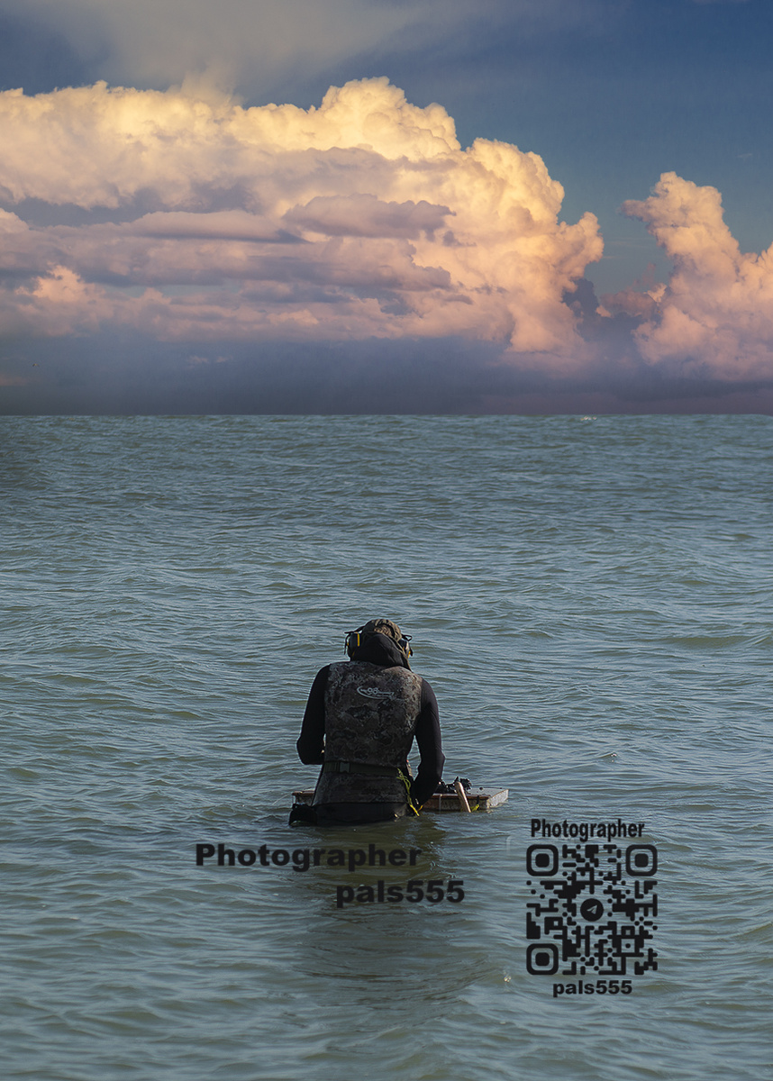 Он стоит в воде по пояс — тихо, почти неподвижно, словно часть этого бескрайнего горизонта.