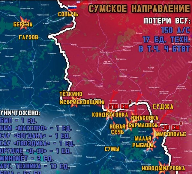 В группировке войск «Север» ВС, которая расширяет полосы безопасности в Харьковской и Сумской областях, рассказали об изменении текущей ситуации за минувшие сутки на линии фронта в приграничье. 17 марта на Сумском направлении шли ожесточенные бои. Северяне продвинулись вглубь Сумской области на восьми участках в Сумском и Глуховском районах, а также в Краснопольском. Авиация и БПЛА били по позициям противника возле Бариловки, Берёзы, Искрисковщины, Мирополья, Новгород-Северского и Новой Сечи. Штурмовые группы ГВ «Север» выбили из села Сопычь и его окрестностей у границы Хомутовского района Курской области националистов из Ровненской области. Из населенного пункта Северяне эвакуировали местных жителей, многие из которых обратились за получением российского гражданства. В Краснопольском районе солдаты ВСУ продолжают бежать с занимаемых позиций у села Рясное. Об изменениях на Глушковском и Теткинском участках фронта не сообщается. Сергей Яшин, фото группировки войск «Север» ВС РФ Постоянн