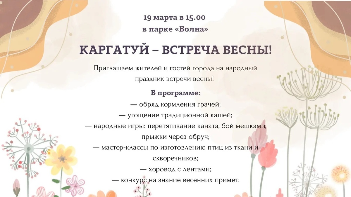 Жителей и гостей города приглашают встретить весну в парке «Волна» 19 марта в парке «Волна» в Уфе состоится народный праздник Каргатуй, посвящённый встрече весны. Об этом сообщает пресс-служба администрации города. Для жителей и гостей города подготовят программу с мастер-классами, народными играми и концертными выступлениями. Участники также смогут познакомиться с традициями и попробовать праздничные угощения. Праздник объединит элементы народной культуры и станет семейным событием, на которое приглашают всех желающих. Начало запланировано на 15:00. Ранее «Уфимские нивы» сообщали, что башкирский АПК наращивает экспорт сельхозпродукции. Фото: пресс-служба администрации города.