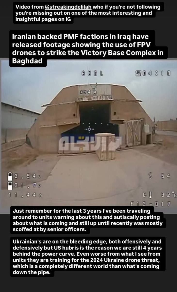 В одной из запрещенных соцсетей можно наблюдать следующую картину. Форварды (Forward Observations Group, FOG) на своих страницах возгорают пятой точкой над кадрами объективного контроля, как иранские дроноводы при помощи FPV залетают в защитные ангары на одной из американских баз в Ираке, где явно находится техника, для защиты которой и нужны эти ангары. Перевод: Поддерживаемые Ираном фракции шиитских народных мобилизационных сил (PMF) в Ираке опубликовали кадры, демонстрирующие использование FPV-дронов для удара по комплексу "Виктори" (Victory Base Complex) в Багдаде. Просто напомню: последние 3 года я ездил по подразделениям и предупреждал об этом, постоянно писал о том, что грядет, и еще совсем недавно старшие офицеры в основном надо мной насмехались. Украинцы находятся на острие прогресса — как в наступлении, так и в обороне. Но американская спесь (hubris) — вот причина, по которой мы всё еще отстаем от реальности на 4 года. Что еще хуже, судя по тому, что я вижу в частях, они