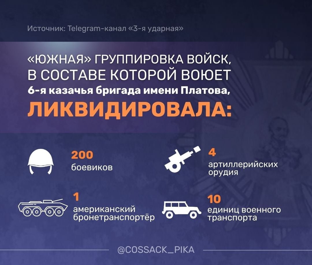 Огромную роль в освобождении села сыграла 6-й отдельная гвардейская казачья Лисичанская мотострелковая бригада имени Матвея Платова. О боевых успехах казаков в цифрах — в инфографике агентства "ПИКА" 👆