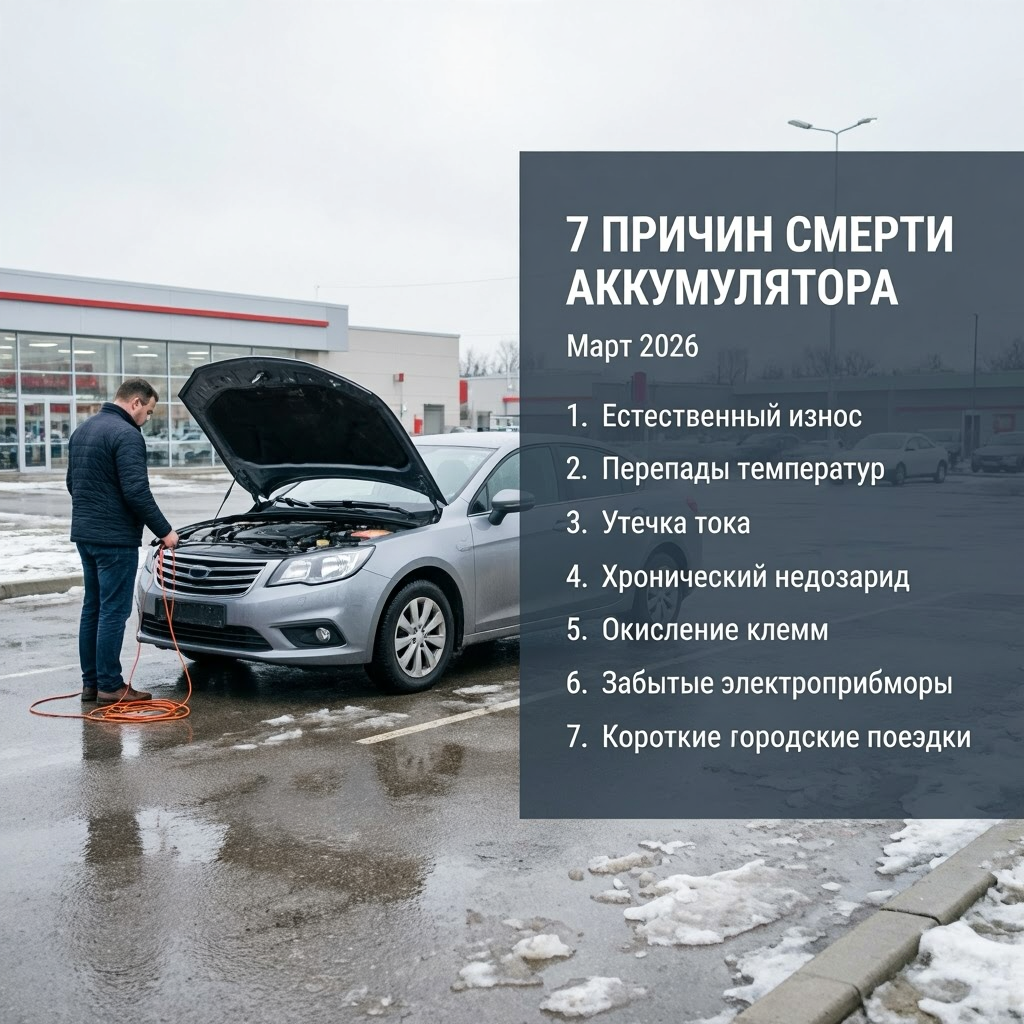 Утро было тёплое, +8°C, машина стояла два дня. Поворачиваю ключ — тишина. Стартер даже не щёлкнул. Пришлось вызывать выездную помощь, платить за прикуривание и потом ехать на диагностику. Мастер посмотрел и сказал: «Классика марта — батарея умерла после зимы».
