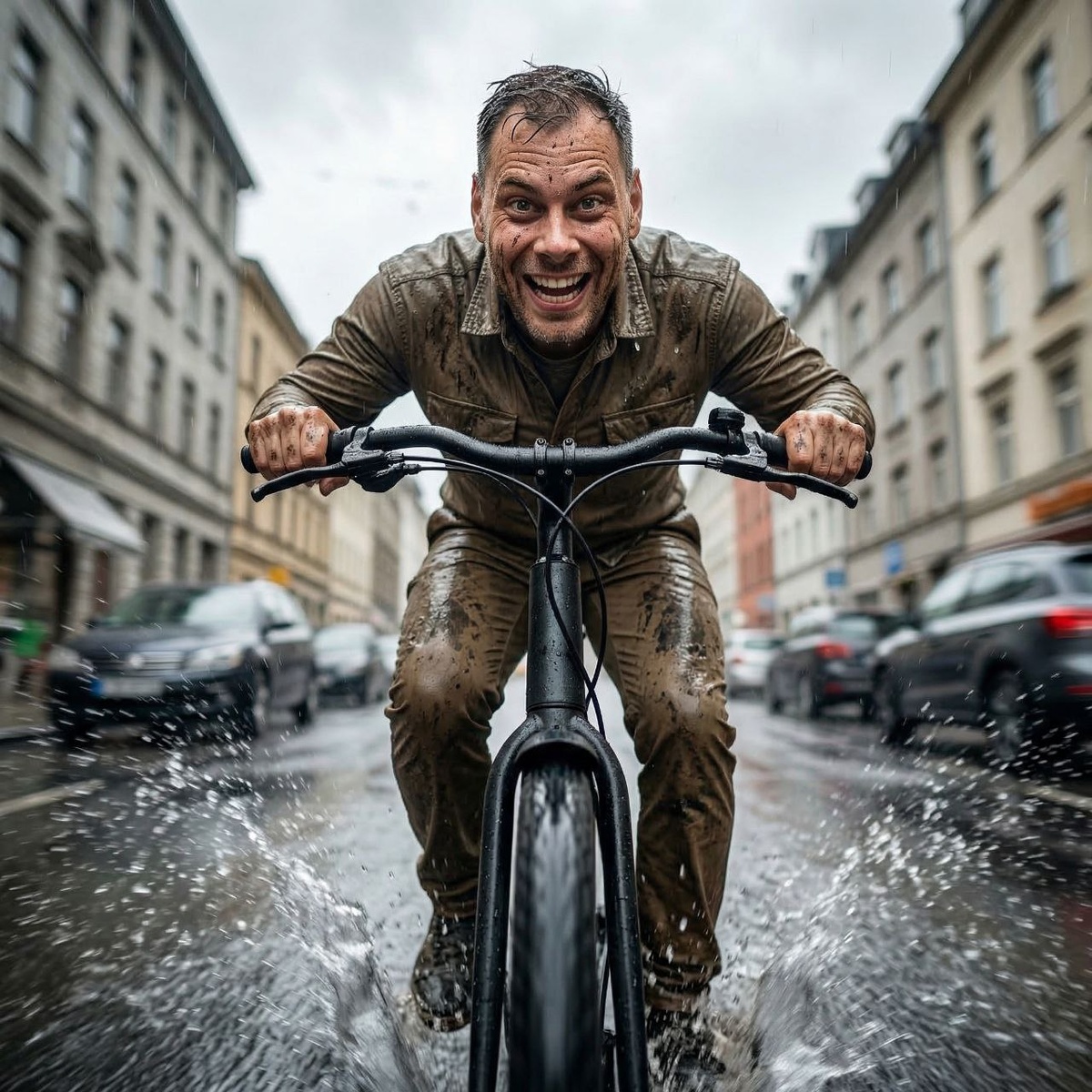 От подписчика @Androklesss Используй прикреплëнное фото человека как референс - перенеси внешность этого человека точь-в-точь, сохраняя черты лица, форму головы, цвет волос, глаз, кожи и все уникальные особенности. Сверхдетализированный фотореалистичный кадр 8K. Мужчина 30–35 лет мчится на матово‑чёрном городском велосипеде прямо на камеру по залитой дождём улице. Лицо в идеальном фокусе, широкая энергичная улыбка, видны зубы, прямой взгляд в камеру; мокрые ресницы; на лице, шее и одежде толстые слои влажной глины и брызги, капли воды стекают. Волосы тёмные, растрёпанные, пряди торчат во все стороны. Одежда — мокрая приталенная рубашка/куртка и брюки, всё перепачкано грязью. Низкий ракурс, широкоугольная перспектива (28–35 мм), переднее колесо крупным планом; из‑под шин летят крупные брызги и комья грязи в объектив. Фон — современная городская улица в пасмурный день: дома и машины растянуты пэннингом, сильный motion blur по заднему плану, лёгкий голландский наклон кадра. Лицо и верх к