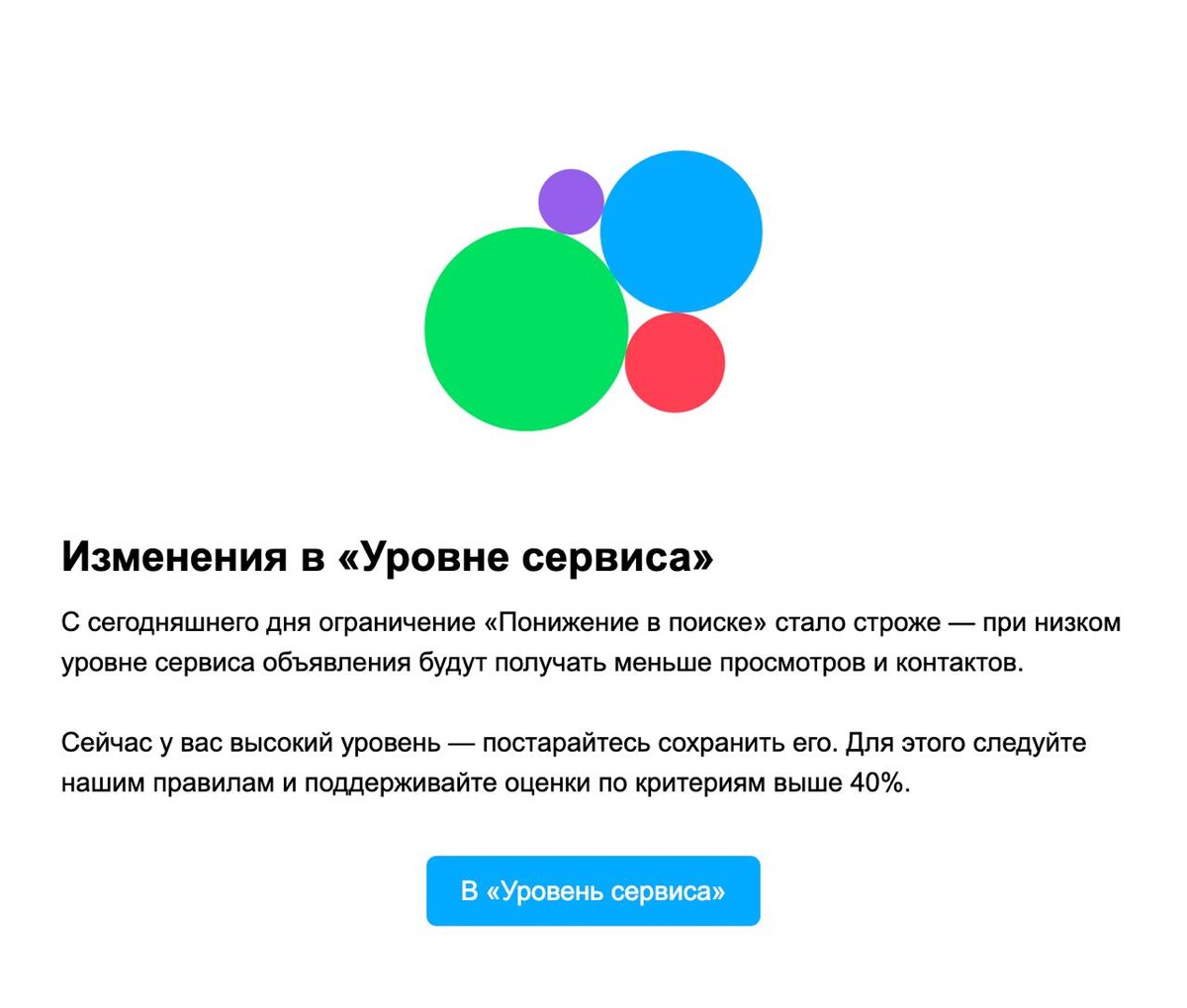 Мы предупреждали!😬 Сегодня 18 марта и обновления по уровню сервиса вступили в силу. Что это значит? Скорее всего, все станет понятно уже в ближайшие недели, но у нас есть предположение. На практике, главная причина снижения уровня сервиса — дублирование объявлений (привет масспостинг). На втором месте по популярности — пропущенные звонки. В свете отмены правил с подтвержденными адресами, карать за масспостинг, вероятно, станут строже. По пропущенным звонкам — сейчас за пропущенные уровень сервиса снижают до 50-60%, то есть он остается в зеленой зоне. Соответственно, никаких фактических последствий для аккаунта не наступает. Видимо, это изменится, и за пропущенные звонки уровень сервиса будут снижать ниже 40%. В итоге те, кто комплексно подходит к проработке объявлений, качественно и вопремя отрабатывает заявки — останутся в плюсе, а те, кто пытается искать дыры в системе и как-то ее обходить...Ну, вы понимаете. В прочем, все как обычно — система побеждает хаос. _____________