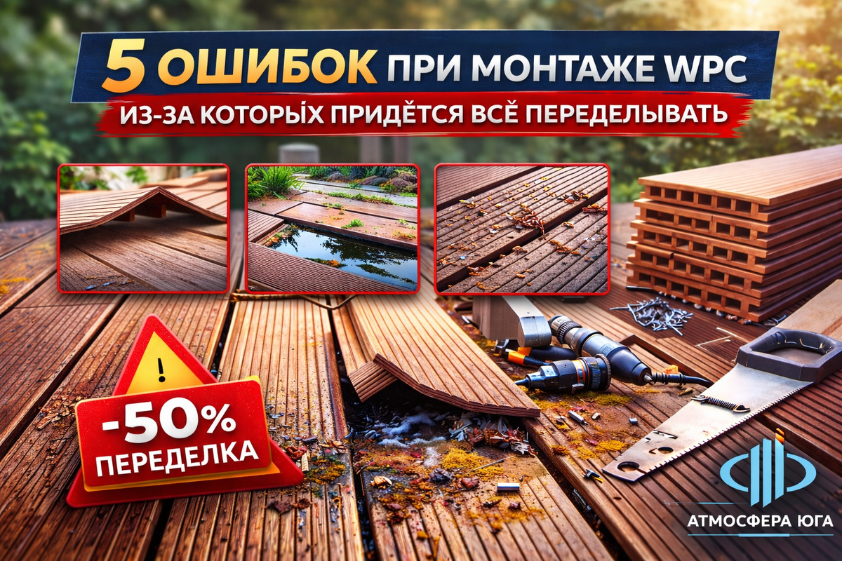 WPC может выглядеть идеально на старте - и «поплыть» уже через сезон. И дело почти никогда не в материале. А в том, как его уложили. Ошибки укладки не всегда заметны сразу - они проявляются после первых морозов, летней жары или просто через год эксплуатации. К тому моменту исправить ситуацию в большинстве случаев можно только через полный демонтаж. А это - время, деньги и нервы. Ошибка первая: не оставлять зазоры на температурное расширение WPC реагирует на температуру: при нагреве расширяется, при охлаждении сужается. Это физика, а не дефект. Если панели уложены вплотную - без зазоров между торцами и между крайней доской и стеной или бордюром - при нагреве им некуда деваться. Результат предсказуемый и неприятный. Как выглядит ошибка: Стандартный торцевой зазор - от 5 мм, боковой - от 3 мм. Точные значения зависят от длины доски, климатической зоны и рекомендаций производителя. Это не опция - это обязательное условие нормальной эксплуатации. Ошибка вторая: укладка на сплошное основание