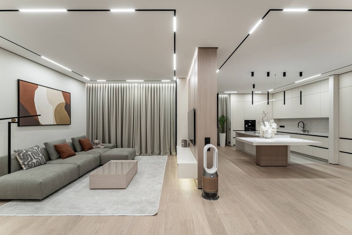 Кухня-гостиная — 33.5 м² с островом и столешницей из кварца.