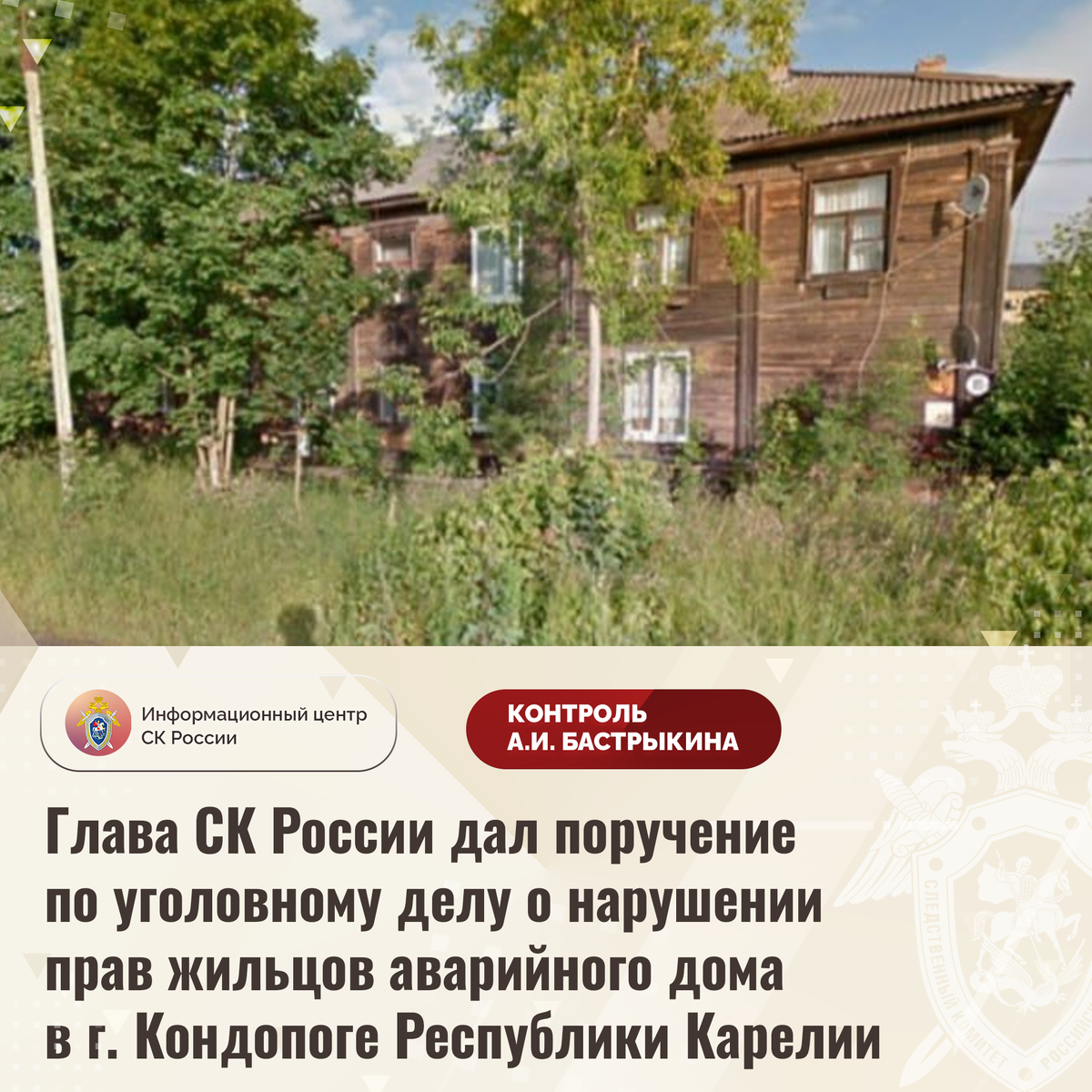 Глава СК России дал поручение по уголовному делу о нарушении прав жильцов аварийного дома в г. Кондопоге Республики Карелии В Информационный центр СК России обратилась жительница Республики Карелии по вопросу несогласия с ходом установления обстоятельств нерасселения жильцов многоквартирного дома на улице Коммунальной города Кондопоги. Длительное время здание 1950 года постройки находится в непригодном состоянии: несущие конструкции, напольные и потолочные перекрытия разрушаются, в связи с нарушением целостности кровли жилые помещения затапливаются, инженерные системы изношены, печное отопление неисправно. В 2017 году ввиду высокой степени физического износа строение признано аварийным, однако благоустроенное жилье гражданам взамен не предоставлено, сроки расселения неоднократно переносились. До настоящего времени виновные лица к ответственности не привлечены, нарушенные права жильцов не восстановлены. В СУ СК России по Республике Карелии расследуется уголовное дело, возбужденное по п