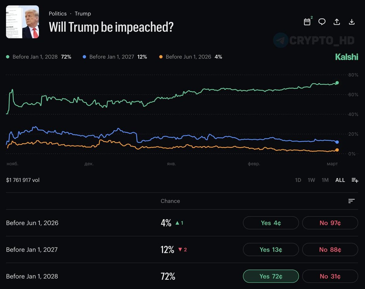 🇺🇸 Вероятность импичмента Дональда Трампа до конца его срока возросла до 72% (исходя из ставок на Kalshi)