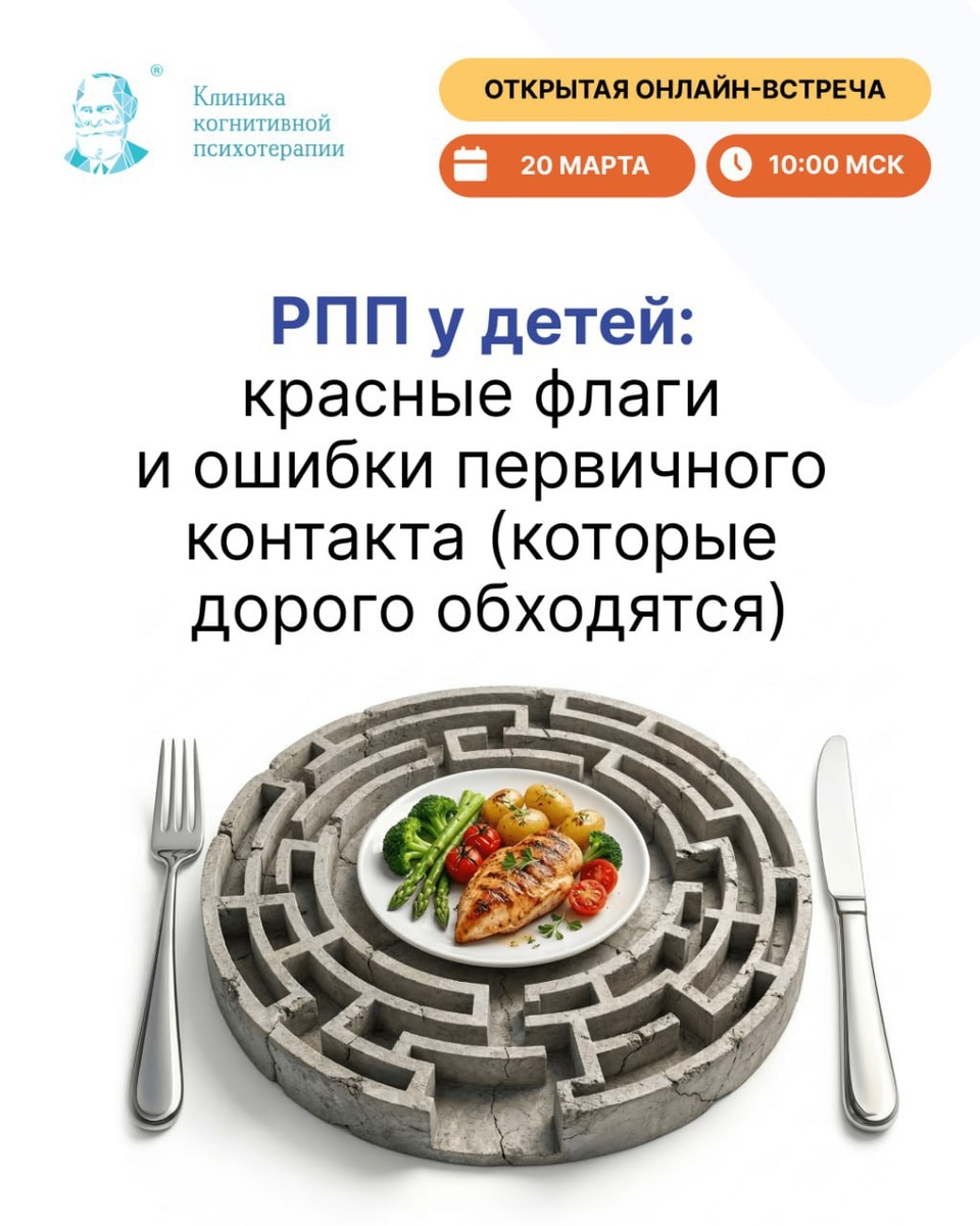 дома» или «переедает от стресса» Но за этим часто пропускается ключевое - где проходит граница между нормой и РПП 📌 Ошибка на этом этапе приводит к неэффективной терапии 🎥 На вебинаре разберём: - признаки начала РПП - короткий скрининг для первого приёма - ключевые вопросы подростку и родителям - оценку уровня риска и срочности ситуации - принципы маршрутизации пациента и критерии, при которых требуется срочная медицинская помощь Ведущая: Марианна Коротина - медицинский психолог, специалист по расстройствам пищевого поведения, специалист CBT Clinic, супервизор, преподаватель Будет полезно: - психологам и психотерапевтам - специалистам, работающим с подростками - тем, кто сталкивается с пищевыми нарушениями в практике 📅 20 марта 🕙 10:00 по МСК Регистрация: https://cbtclinic.education/eating_disorder
