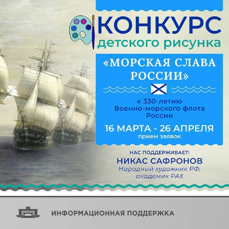 Стартовал Всероссийский конкурс «Морская слава России» от Фонда Андрея Первозванного. К участию приглашаются дети от 7 до 15 лет 🎨 🧭 Что можно изобразить — героев морской истории — корабли и экспедиции — флот будущего 📅 Сроки Заявки принимаются до 26 апреля 2026 года. Итоги — 1 июня. 🎁 Гран-при — выпуск работы в виде почтовой открытки. Победителей ждут призы. 📩 Подать заявку: https://fap.ru/tpost/lvzh7idhp1-vserossiiskii-konkurs-detskogo-risunka-m Успейте принять участие ✨