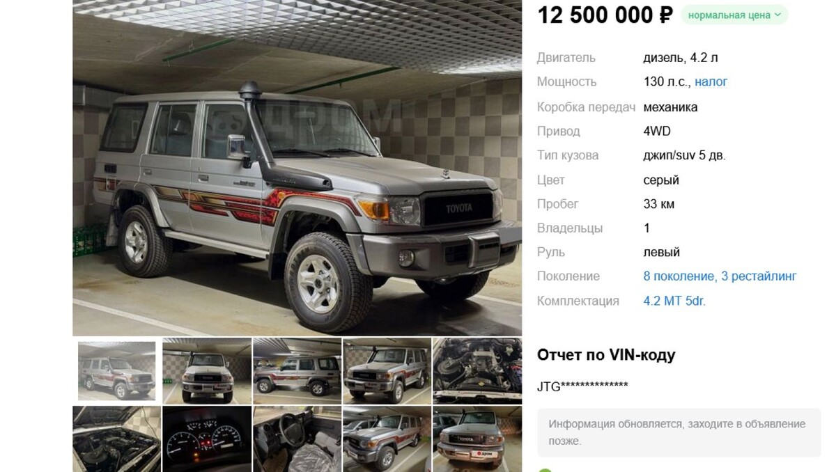 Сняли с учета и продают Toyota Land Cruiser 76 2016 года: прошло 10 лет, а он как новый В Москве появился уникальный шанс приобрести Toyota Land Cruiser 76 Series 2016 года с минимальным пробегом - всего 33 км. Автомобиль из частной коллекции, полностью заводской, без изменений и вмешательств. Почему такие предложения вызывают ажиотаж и какова реальная ценность подобных экземпляров - разбираемся в деталях. Фотография: 110km.ru На рынке подержанных автомобилей Москвы появилось по-настоящему редкое предложение - на продажу выставлен Toyota Land Cruiser 76 70 Series 2016 года выпуска, который практически не эксплуатировался. Пробег этого внедорожника составляет всего 33 километра, что делает его уникальным для российского рынка. Автомобиль находится в идеальном состоянии, сохранив все заводские характеристики и детали, без малейших изменений или доработок. Для многих автолюбителей подобные экземпляры - настоящая находка. В условиях, когда новые автомобили Toyota Land Cruiser официально не