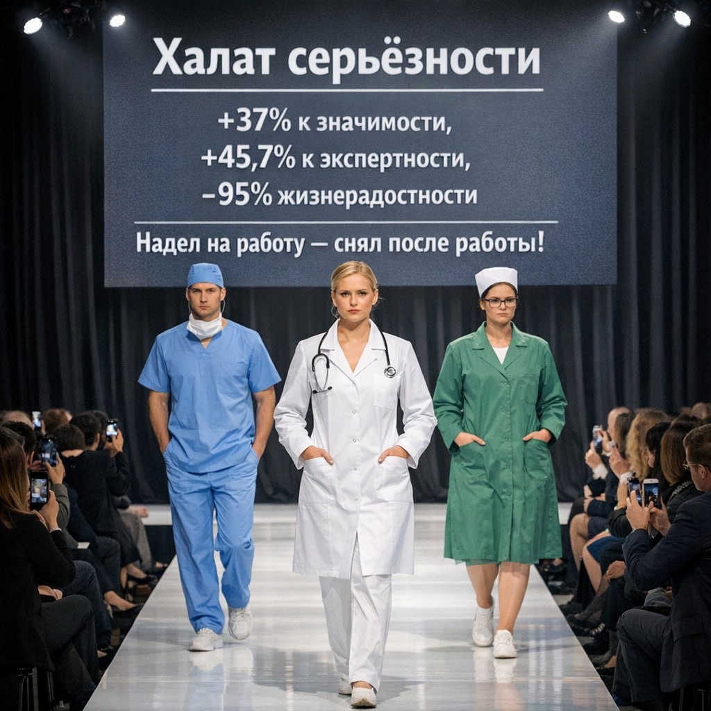 ™ 😆 Дружище! Тебя не воспринимают всерьёз? 😆 Ты приходишь на работу с улыбкой — а коллеги думают, что ты дурачок? 😆 Ты — Проектор, который реально видит, как всё устроить лучше, но тебе говорят: «Чё ты лыбишься? Серьёзные люди так себя не ведут!» 😆 Твой начальник — скуф с лицом кирпича — получает в три раза больше просто потому, что выглядит так, будто у него геморрой и ипотека одновременно? Хватит это терпеть! Наши дизайнеры-бодиграфисты совместно с НИИ Унылости зафигачили: 🥼 ХАЛАТ СЕРЬЁЗНОСТИ™ Надень эксперта — сними человека! Характеристики: 📊 +37% к значимости 📊 +45,7% к экспертности (цифра с дробью — потому что круглые числа недостаточно серьёзные) 📊 −95% жизнерадостности (оставшиеся 5% — на случай если кто-то на корпоративе расскажет ОЧЕНЬ смешную шутку. Допускается лёгкое подёргивание уголка рта. Один раз в квартал.) Как работает? Утром надел — и хоп! Лицо само складывается в выражение «я тут решаю вопросы». Брови сдвигаются. Голос падает на полторы октавы. Ты