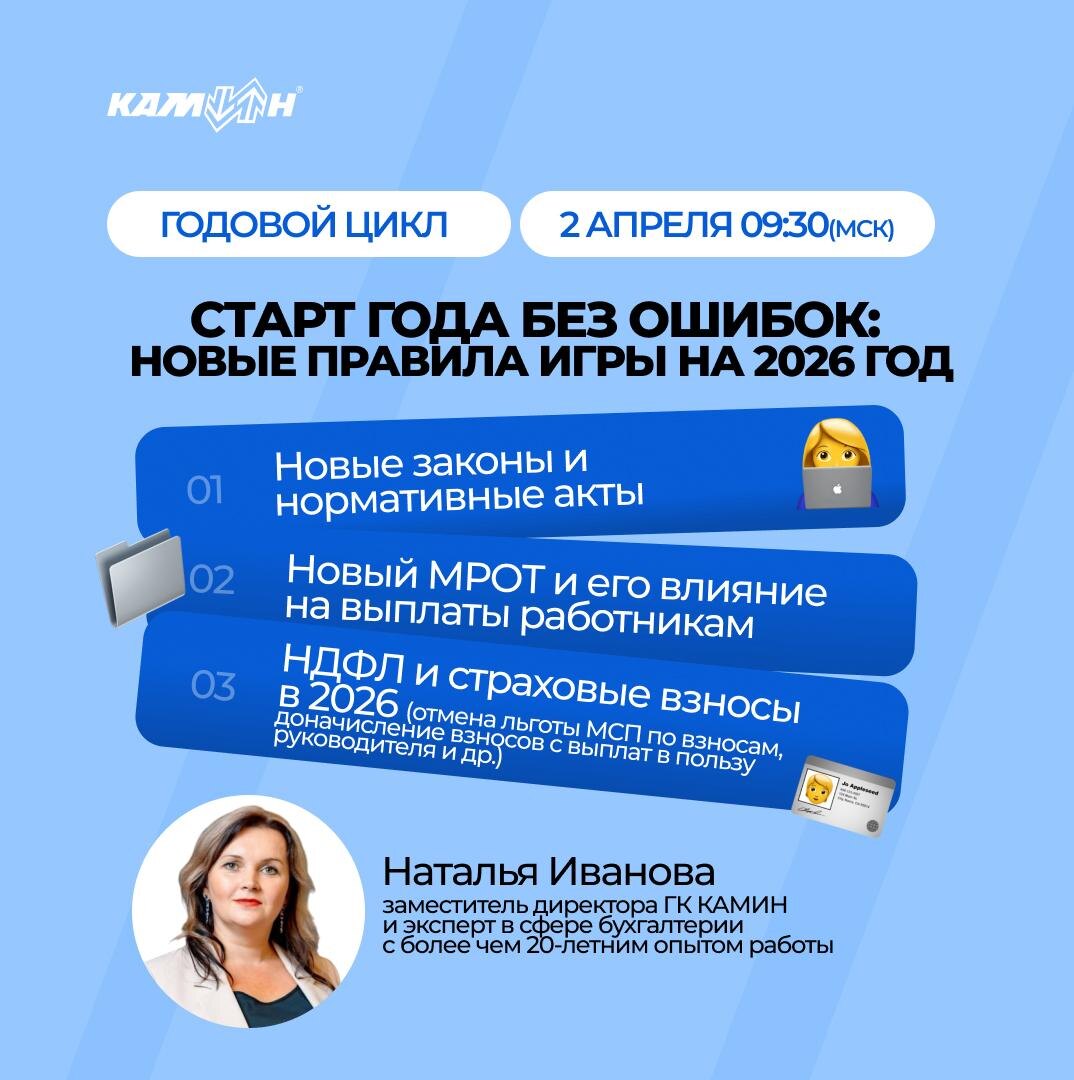 😬 Так и в расчёте зарплаты: одна неверная цифра, забытый вычет или некорректная выплата пособий может нарушить весь процесс и привести к лишним исправлениям и проверкам. 😶 Чтобы избежать таких «сюрпризов», приглашаем вас на семинар «Старт года без ошибок: новые правила игры на 2026 год», где разберём все ключевые изменения и тонкости 2026 года. 👨💻 2 апреля в 09:30(мск) стартует новый годовой цикл онлайн-семинаров повышения квалификации бухгалтера по расчёту заработной платы. Регистрация На семинаре разберём: 👌 Новые законы и изменения в ТК РФ, классификатор профессий 👌 МРОТ 2026: что включать, а что нет 👌 Пособия и работа через СЭДО 👌 НДФЛ и страховые взносы: изменения для руководителей, дистанционщиков и ГПД 👌 Практические кейсы и ответы на ваши вопросы ⚡️ В ходе семинара будет показана работа на примере программ КАМИН, а участники смогут задать свои вопросы. 💻 Если отправить вопрос заранее на uc@kaminsoft.ru, он может быть включён в программу как отдельная тема. 👏 Ав