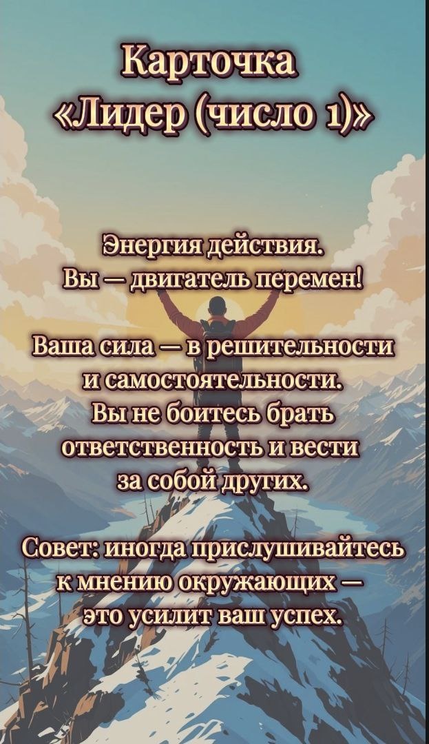 ) Сложите все цифры выбранных ответов и найдите свой тип: 5–9: Лидер (число 1) Вы прирождённый инициатор! Энергичны, самостоятельны и не боитесь брать ответственность. Ваша сила — в решительности, но иногда стоит прислушиваться к другим. 10–14: Дипломат (число 2) Ваша суперсила — умение находить баланс. Вы тонко чувствуете окружающих и легко налаживаете контакты. Избегайте чрезмерной зависимости от чужого мнения. 15–19: Творец (число 3) Вы излучаете позитив и креатив! Любите общение и самовыражение. Главное — не разбрасываться на множество идей: фокусируйтесь на главном. 20–24: Стратег (число 4) Практичность и системность — ваши козыри. Вы строите надёжные планы и добиваетесь целей шаг за шагом. Иногда стоит дать себе отдохнуть от рутины. 25-29: Авантюрист (число 5) Свобода и перемены — ваш девиз! Вы гибки, любознательны и легко адаптируетесь. Совет: ставьте чёткие цели, чтобы энергия не рассеивалась. 30–34: Хранитель гармонии (число 6) Вы создаёте уют и поддерживаете близких. В