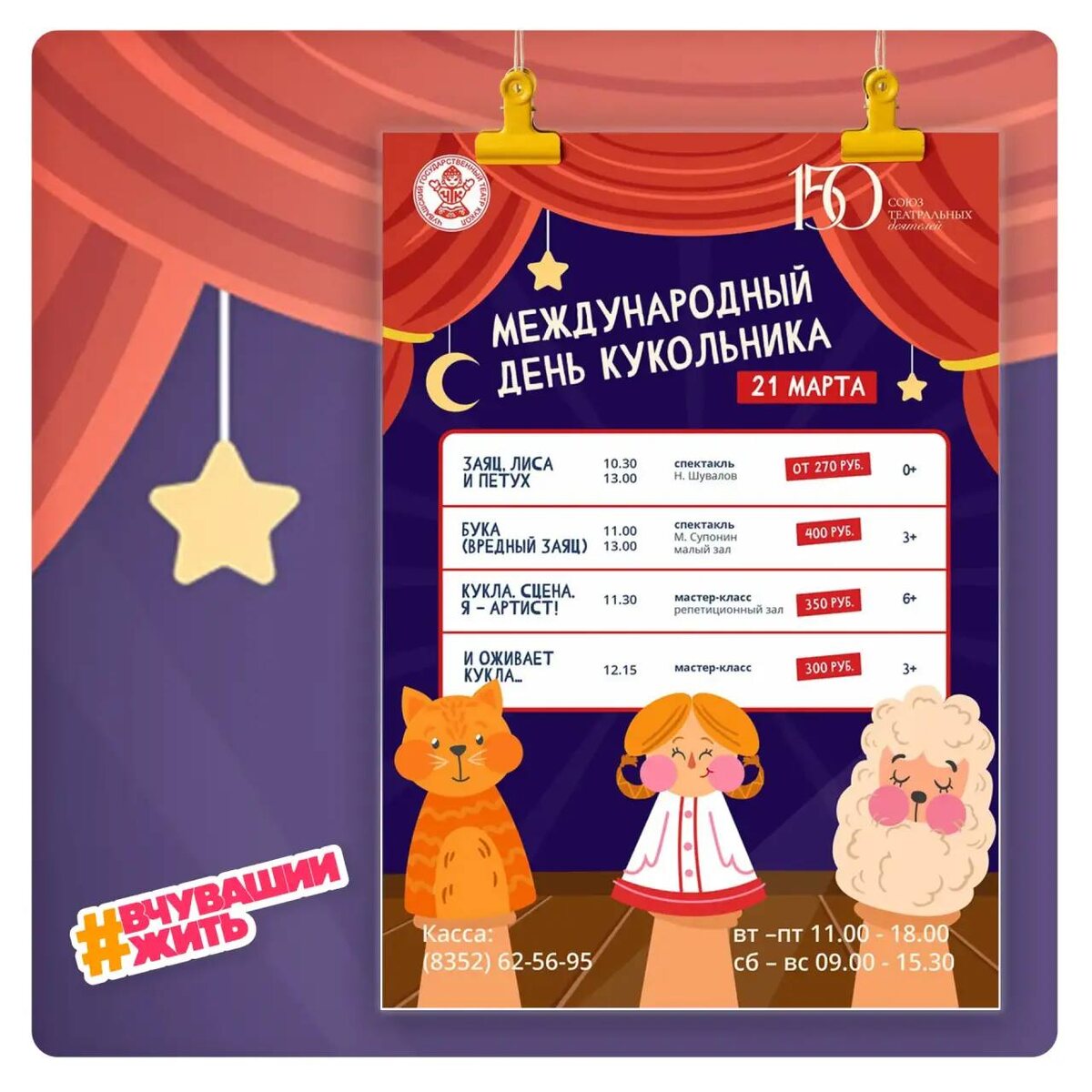 21 марта во всем мире отмечается Международный день театра кукол и кукольника. Того самого, который может искусно сыграть и вредного зайца, и даже короля Лира. 🐰👑 Это вам не просто разговаривающие цветные носки, а настоящее искусство! Ощутить его можно в спектаклях и мастер-классах, которые пройдут в Чебоксарах в честь праздника. 📆 21 марта 📍 Чувашский государственный театр кукол Мы в MAX / Предложить новость