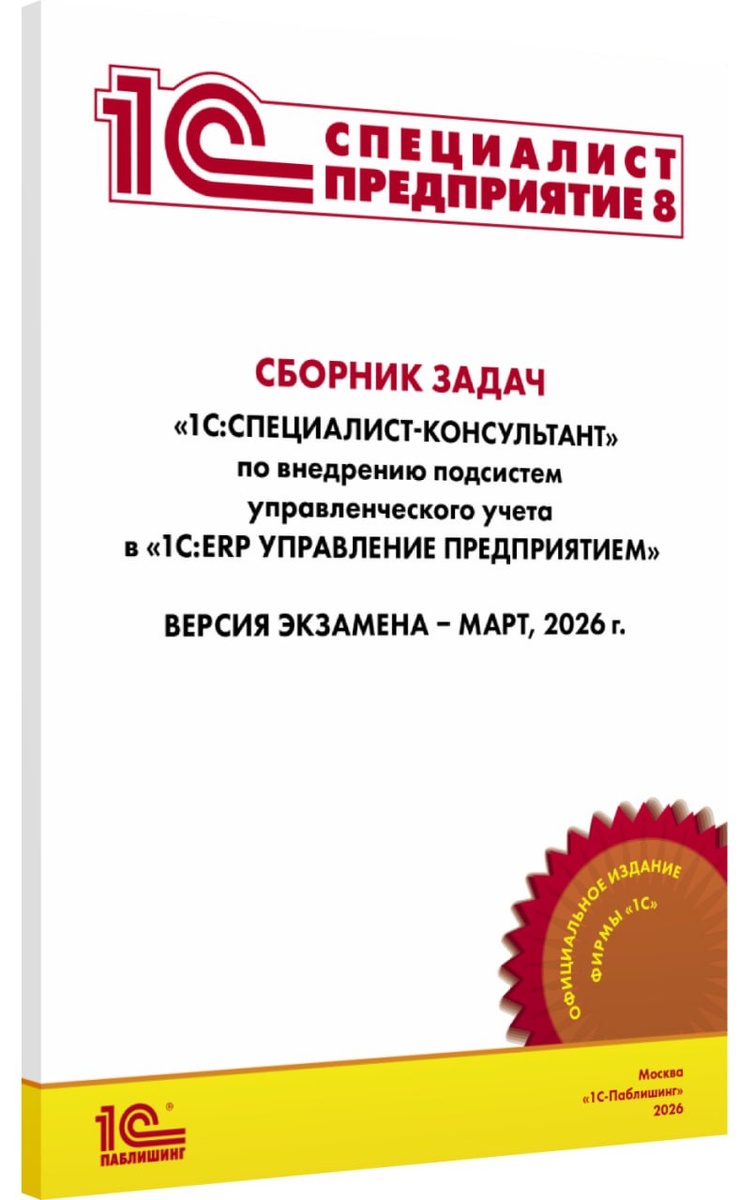 !🔥 ‼️ Сборник задач для подготовки к экзамену "1С:Специалист-консультант" по внедрению подсистем управленческого учета в "1С:ERP Управление предприятием". Версия экзамена – март 2026 года ⚡️ Книга доступна в продаже в печатном варианте, спрашивайте у партнеров вашего города. Электронная версия в стадии подготовки, традиционно появится в продаже на сайте Учебного центра №1 С 20 апреля экзамен 1С:Специалист-консультант по Управленческому учету в 1С:ERP будет приниматься по билетам, составленным на основе задач из нового сборника. 📌 Также информируем вас, что с понедельника, 23 марта, для сдачи экзаменов 1С:Специалист-консультант по 1С:ERP будет доступен новый релиз – 2.5.25.109 ‼️ Все новости, анонсы и полезные материалы — в нашем канале в MAX, подписывайтесь!