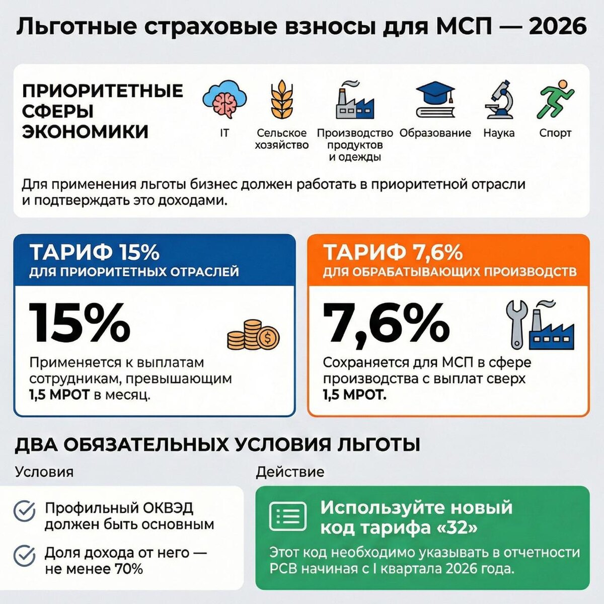 Коллеги, разбираемся с важным нововведением! С 1 января 2026 года для субъектов МСП из приоритетных отраслей действует пониженный тариф страховых взносов — 15% с выплат свыше 1,5 МРОТ. 🎯 Кому доступна льгота? Компаниям и ИП из таких сфер: 🌾 Сельское хозяйство, рыболовство 🏭 Производство (продукты, одежда, лекарства, электроника, металлургия) 💻 IT и телекоммуникации 📚 Образование, наука, культура, спорт ✅ Два обязательных условия: Ваш основной ОКВЭД в ЕГРЮЛ/ЕГРИП должен быть из льготного списка (распоряжение Правительства № 4125-р от 27.12.2025) Доля доходов от основного вида деятельности — не менее 70% ⚠️ Важно! В РСВ с I квартала 2026 года используйте новый код тарифа «32» (вместо старого «20») Если перестали соответствовать условиям — теряете право на льготу с начала того периода, когда это произошло 💡 Для обрабатывающих производств тариф остался прежним — 7,6% с выплат свыше 1,5 МРОТ. Проверьте свои ОКВЭДы и долю доходов, чтобы законно применять льготу! Источник: Информация ФН