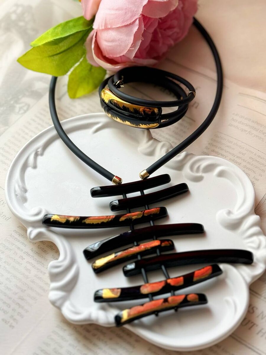 🖤 Это колье — настоящий арт-объект, объединяющий графичность черных линий и тепло золотистых мазков. Такая сложная форма требует продуманного окружения, и наши стилисты подготовили для вас два безупречных сценария. Для офиса сочетайте колье с белоснежной хлопковой рубашкой и классическими брюками из плотной шерсти цвета антрацит или глубокого синего. Гладкая фактура ткани подчеркнет глянцевый блеск стекла, превращая строгий деловой аутфит в модный образ. А на вечер наденьте колье под приталенный жакет или с лаконичным платьем-комбинацией из тяжелого матового шелка в оттенках жженой карамели или терракоты. Сложная геометрия украшения станет главным акцентом на фоне струящейся ткани, создавая эффектный и статусный образ. Колье 6000 Браслет 2850 ✨Нажмите для заказа ✉️ Нажмите чтобы задать вопрос