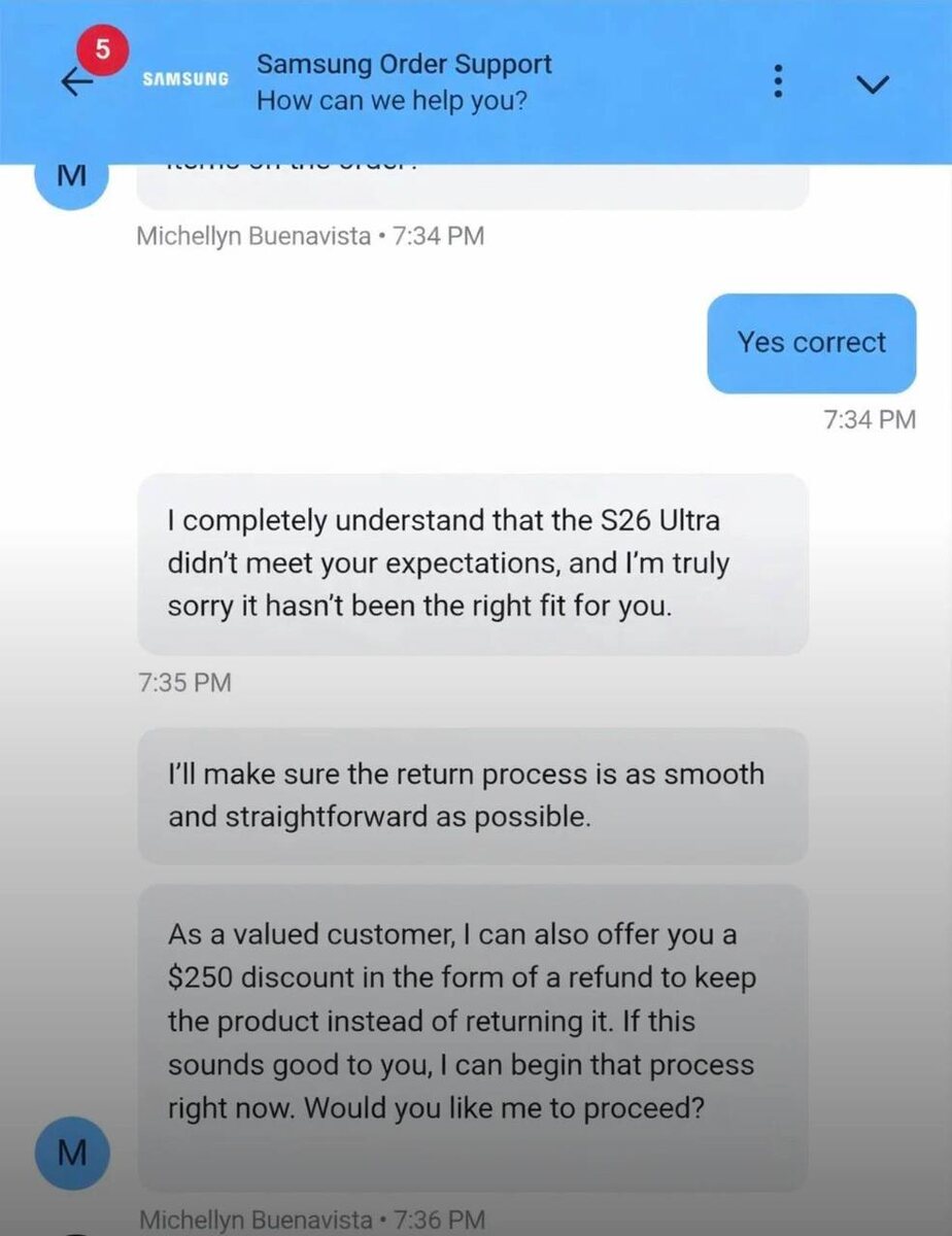 » 😅 Интернет поймал новый мем: якобы Samsung предложила пользователю $250, лишь бы он не возвращал свой Galaxy S26 Ultra. История всплыла на Twitter (ну ладно, X), где пользователь показал скриншот переписки с поддержкой. Суть простая: • человек хотел вернуть смартфон • устройство ему не зашло • в ответ саппорт предложил промокод на $250, если он оставит девайс Что это вообще было С высокой вероятностью — это не «официальная политика щедрости», а: • частный кейс поддержки • попытка снизить возвраты (они дорого обходятся компаниям) • или вообще региональная акция/ошибка сотрудника Такие штуки иногда встречаются: бренду дешевле дать скидку, чем: • принимать возврат • проверять устройство • перепродавать как refurbished Но мем получился отличный Контраст максимально жирный: «Телефон не понравился» «А если мы вам заплатим, чтобы понравился?» 🤝 Если история подтвердится как массовая практика — это уже будет интересный сигнал о продажах. Но пока это выглядит как единичный случай,