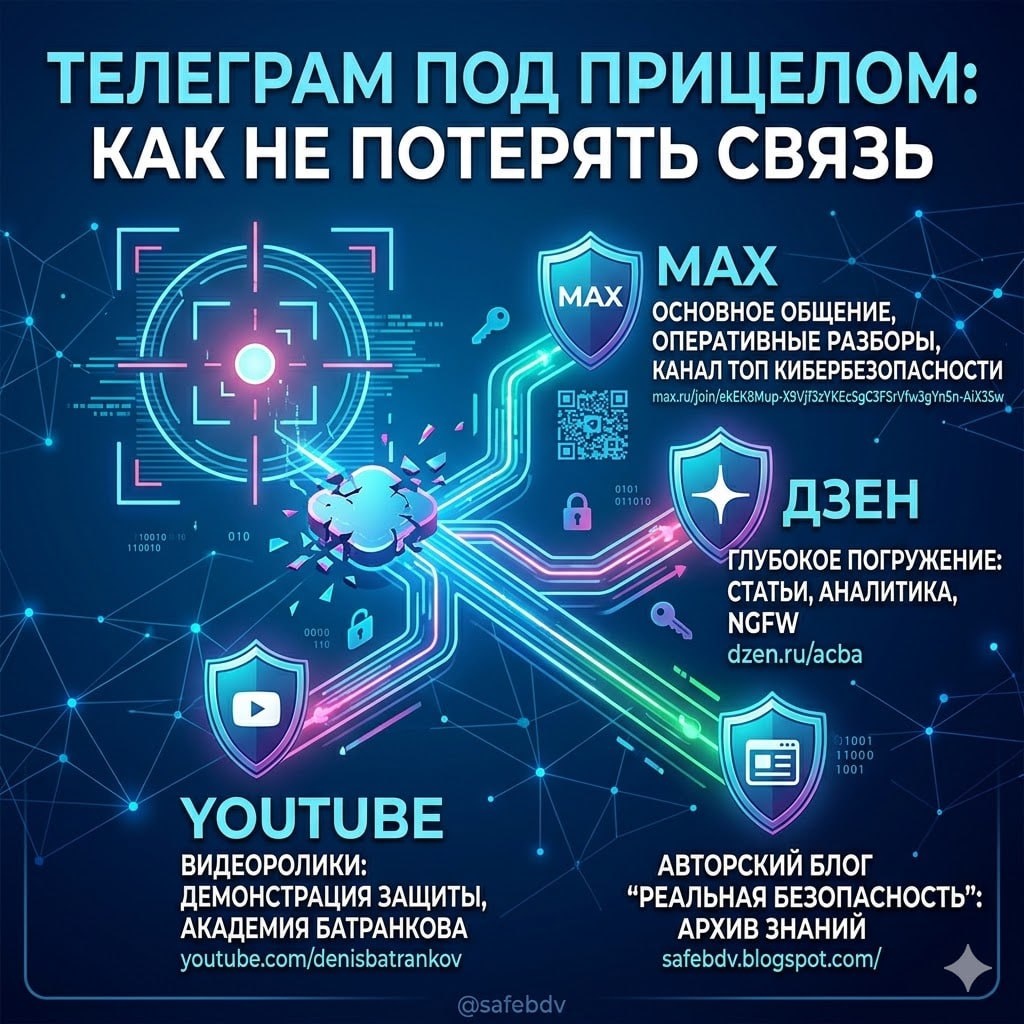Лично мне ограничения мешают вовремя узнавать о новых технологиях и методах защиты данных. Я все время в контексте новинок ИТ, ИБ и ИИ, делаю выжимку для Вас и публикую всеми доступными способами. Чтобы сохранить для Вас доступ к экспертному контенту по кибербезопасности, я буду использовать альтернативные площадки. Платформа MAX — осваиваю новый способ Основное общение и оперативные разборы сегодня переносятся в MAX. Эта площадка обеспечивает сейчас стабильную новостную ленту и позволяет публиковать материалы без риска внезапной блокировки. Там буду публиковать советы по сетевой безопасности в любой ситуации, параллельно с Телеграм. Вступайте сегодня в закрытую группу в MAX, где теперь будет канал "Топ Кибербезопасности": max.ru/join/ekEK8Mup-X9Vjf3zYKEc5gC3FSrVfw3gYn5n-AiX35w Портал Дзен для глубокого погружения Статьи, подробные чек-листы и аналитика дублируются на платформе Дзен. Формат длинных текстов помогает детально разбирать работу NGFW и алгоритмы защиты домашних сетей.