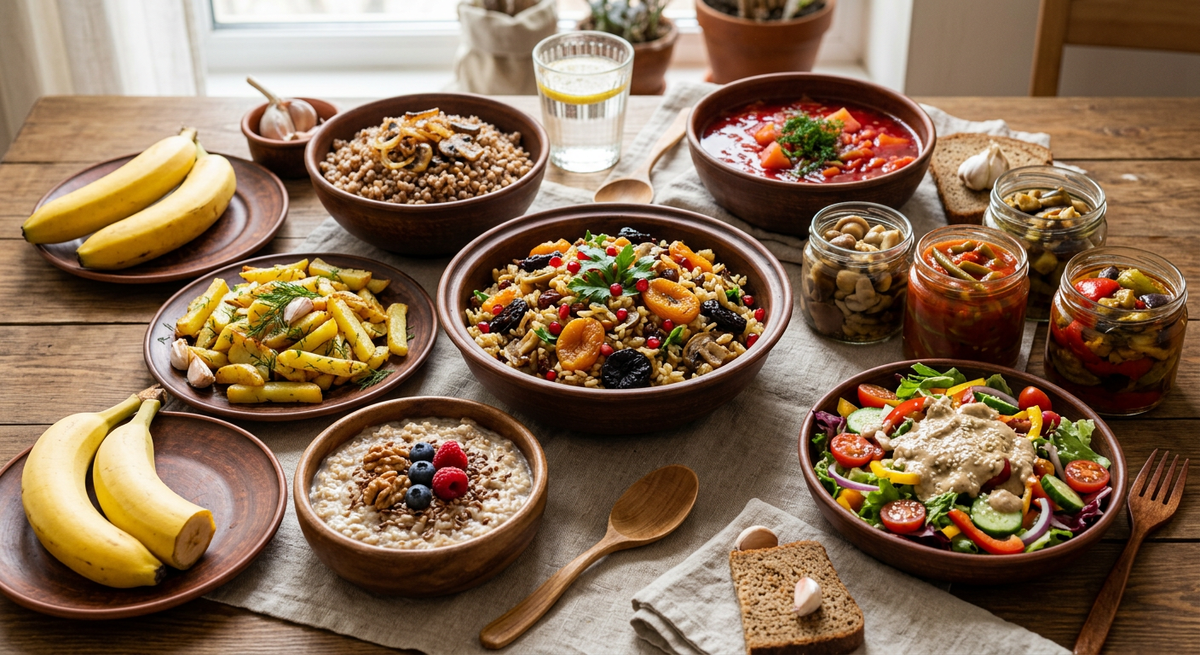 Плов с сухофруктами и грибами: грибы, курага, чернослив, изюм, клюква, гвоздика, вяленные сливы и вишни, тыква, айва, яблоко, семечки подсолнечника и фисташки. риса и сухофруктов беру 1:1. Ни чернослив, ни вяленые сливы не разрезаю, чтобы при варке плова они не превратились в кашу Рис, гречка, жаренная картошка Каши на воде Овощные консервы: фасоль, грибы, перец, баклажаны и кабачки Каши на воде Салаты с овощами на ореховом соусе, вместо майонеза Борщ без мяса, но с прожаркой Бананы Грибы