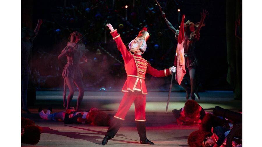 Рождественский бал сверкает польками и галопами. Одноглазый Дроссельмейер (Дмитрий Сагдеев) «угощает» гостей танцами механических кукол. Из больших коробок, похожих на шкафы, выскакивают бодрые Арлекин (Ринтаро Мукаи) и Коломбина (Софья Туманова), грациозные Маркитантка (Манаэ Банно) и Рекрут (Денис Мазанов). Еще одна кукла — Ирландец (Максим Морозов). Ее не было ни в одном из виденных «Щелкунчиков», и открыл ее Бурлака: в архивах мемориального музея композитора в Клину он нашел музыку, написанную Чайковским специально к балету «Щелкунчик», и поставил живую динамичную вариацию Ирландца. Бодро марширует Зайчик-барабанщик (Искандар Абельгузин). Усталая Бабушка (Ольга Марочкина) возит на инвалидном кресле Дедушку (Кирилл Софронов), который потерял способность ходить, а он вдруг пускается в пляс вместе со своей заботливой женушкой.