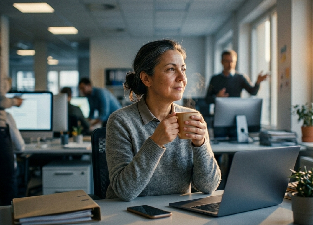 Офис оживает. Слышен гул лифта, хлопанье дверей, далёкий стрёкот принтера и чьи-то бодрые обсуждения планов на квартал. Но для Ирины (наша героиня) мир пока ограничен краями её рабочего стола и теплом керамической чашки в ладонях. Это её буферная зона. Священные 15 минут, когда компьютер уже включен, но почта ещё не открыта. Мессенджеры безмолвствуют, а телефон лежит экраном вниз. Зачем нам эти четверть часа «ничегонеделания» на рабочем месте? Часто этот ритуал приходится защищать. Ирина научилась вешать на лицо «табличку» вежливой отстраненности. Она кивает проходящим мимо, но не вступает в диалог. Её поза — чуть согнутые плечи, взгляд в чашку — транслирует: «Я еще не здесь, подождите». Это маленькое восстание против корпоративной культуры, требующей быть «включенной» с первой секунды прикладывания пропуска к турникету. Это признание: «Я человек, и мне нужно время, чтобы проснуться для этого мира».