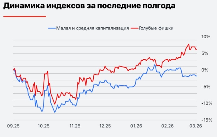 Пока на рынке толком ничего не происходит, хочется отметить одну любопытную тенденцию. Пару месяцев назад я уже писал о том, что голубые фишки выглядят лучше рынка в целом. С тех пор этот тренд только усилился — за полгода индекс фишек прибавил 6%, а индекс Мосбиржи «брутто» остался на том же уровне. В то же время индекс компаний малой капитализации ушел в минус на 2%. Собственно, «малыши» уже три года болтаются в боковике, ведь в текущих условиях им тяжелее всего. Так что более высокие риски не всегда означают хорошую доходность :) Эта тенденция лишний раз подтверждает, что инвесторы больше не хотят рисковать. Ведь многие такие попытки — покупка «растущих» акций, крипты, ВДО и т.д. — в прошлом обернулись потерями. Поэтому сейчас они выбирают что-то более безопасное. Хотя акции нельзя назвать безопасным активом, у голубых фишек есть ряд преимуществ: ✅ Дешевый долг. Крупные компании (особенно приближенные к гос-ву) могут занимать дешевле. Даже если они перегружены долгами, то им все рав