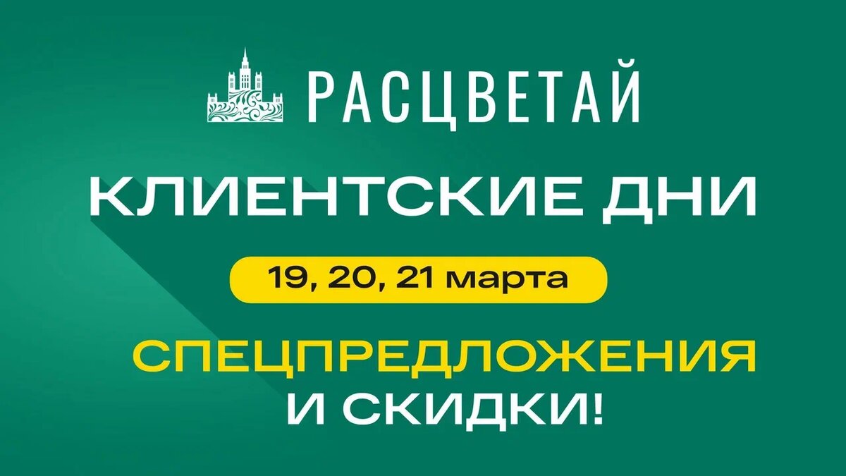 Только 19,20,21 марта ГК «Расцветай» запускает специальные весенние предложения на пул квартир и апартаментов*. ✅ выгода на готовое жилье до 900 000 рублей, на строящееся — до 550 000 рублей, на апартаменты — до 4 300 000 рублей **; ✅ выгодные ипотечные программы от банков-партнеров**; ✅ гибкие условия покупки от застройщика. Успейте купить недвижимость этой весной! Подробности на сайте и по телефону +7 (383) 255 88 22. Предложение ограничено. *Апарт-комплекс «Тайм Парк»: застройщик ООО СЗ «Янтарь»