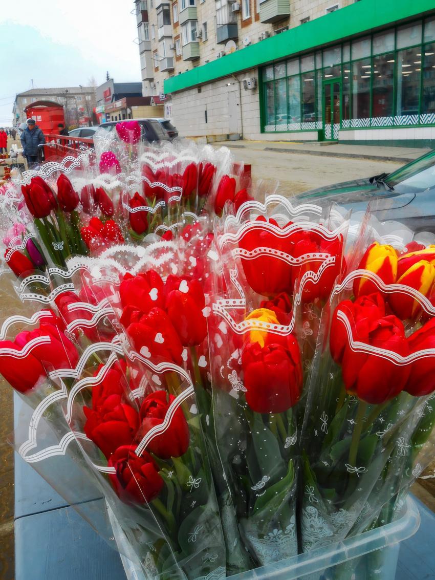 Хозяева тюльпанов комментируют появление своего ароматного товара уклончиво: мол, "просто продаем, прошедший праздник не при чем". Цены на букеты щадящие - 200-250 рублей за 3 пышных цветка.